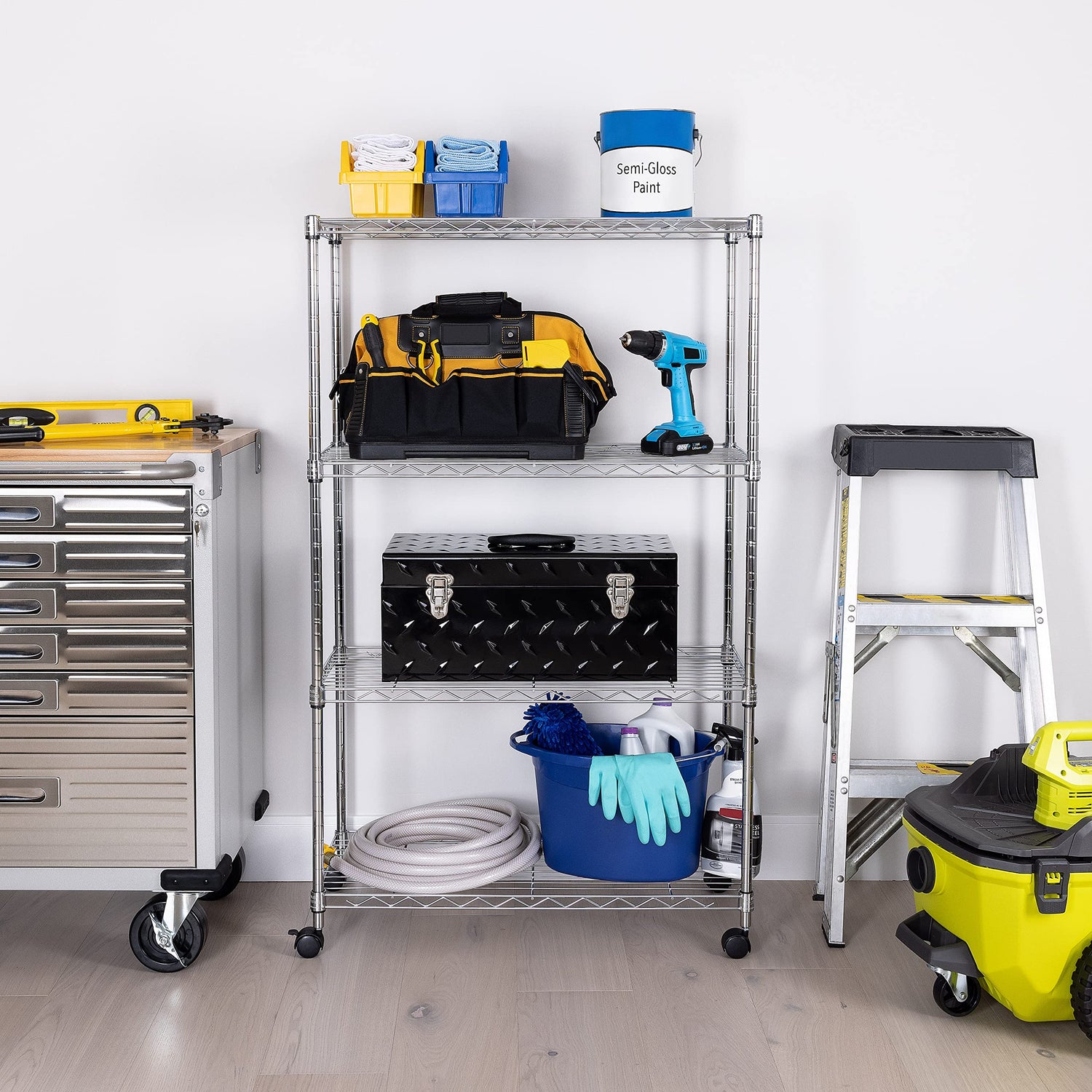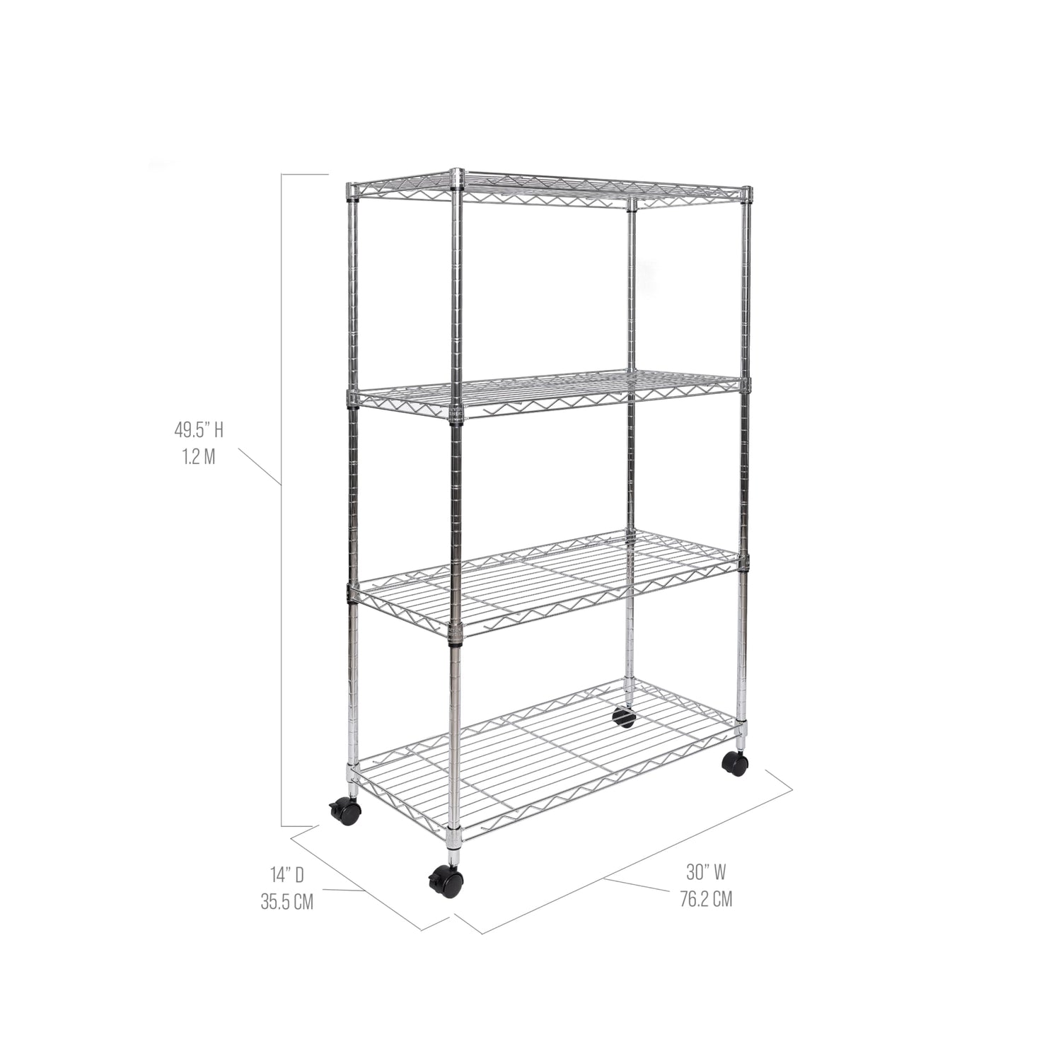 Details: Organize your home or office with Seville Classics' 4-Tier Shelving Systems. This system is constructed from industrial-strength steel and features chrome plating for protection against corrosion in dry and heated storage environments. Shelves hold up to 300 lbs. each on leveling feet. These shelves are perfect for adding extra storage around the house, tidying garages, and organizing office spaces. Install the shelves with casters for a mobile storage solution. Industrial-strength steel wire construction for multipurpose storage Chrome plating provides necessary corrosion resistance in dry environments Casters allow for easy positioning in the kitchen, garage, or office Shelves adjust at 1" increments Includes 4 casters (with 2 locking) and leveling feet No tools required for assembly Limited 10-year Specifications Dimensions: 30" W x 14" D x 48" H (49. 5" H with casters)Capacity on leveling feet: 300 lbs. per shelf Total system capacity on leveling feet: 1500 lbs. Total system capacity on casters: 130 lbs. Weight: 24 lbs. Model #: WEB674