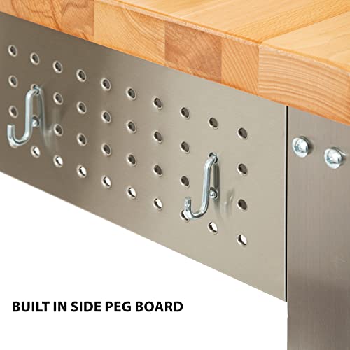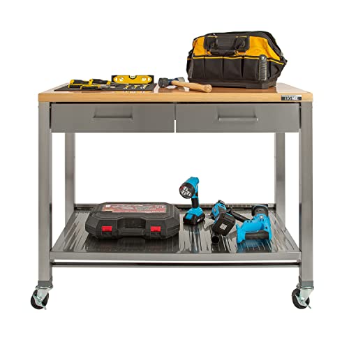 The Seville Classics Home Work Center Island Stainless-Steel Table with Solid Wood Top, 48" W x 24" D x 37.5" H is designed for versatile use around your home, garage, warehouse, or business. Featuring a 48” wide x 1.5” thick polyurethane-coated solid wood top, 2 stainless steel drawers, and a height adjustable solid stainless-steel shelf. Stainless-steel drawer fronts and frame feature an UltraGuard® fingerprint and smudge resistant coating. Each drawer includes a non-slip liner to ensure your items stay in place. This mobile design features four 3” rubber wheels (2 locking). Total weight capacity is 500 lb. (50 lb. per drawer, 100 lb. per shelf, and 300 lb. on wood top). This product requires assembly and all tools required are included.