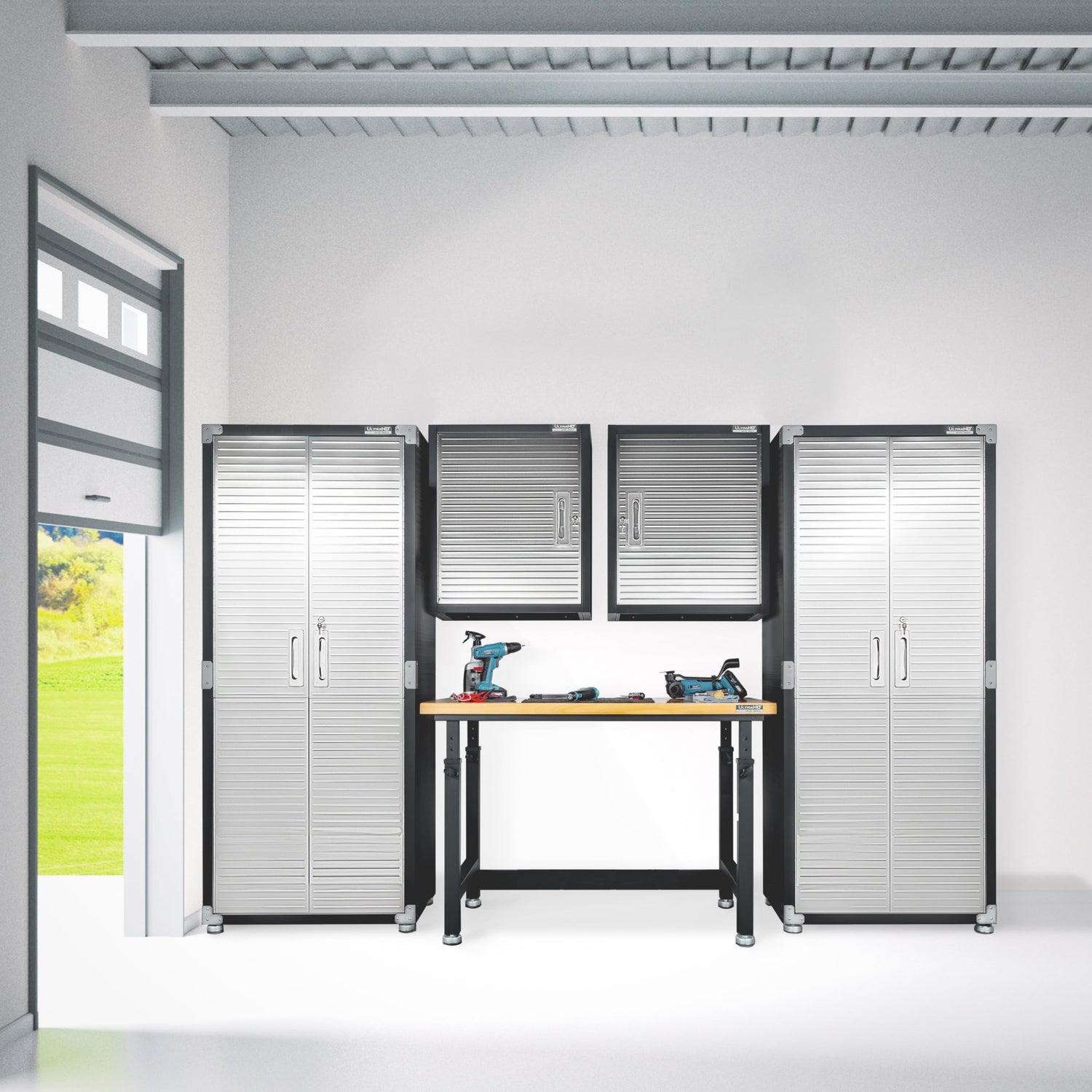 Details: Storage system footprint: 108" (9 feet) W x 24" D x 72" H Storage system includes: Granite: UHDK20190 2-Pieces of UltraHD Storage Cabinet, 30" W x 18" D x 72" H (model no. UHD20162B). View product details here. 2-Pieces of UltraHD Wall Storage Cabinet, 24" W x 12" D x 24" H (model no. UHD20229B). View product details here. 1-Piece of UltraHD Height Adjustable Workbench, 48" W x 24" D x 28.5" to 42" H (model no. UHD20288B). View product details here. Graphite: UHDK20400 2-Pieces of UltraHD Storage Cabinet, 30" W x 18" D x 72" H (model no. UHD16247). View product details here. 2-Pieces of UltraHD Wall Storage Cabinet, 24" W x 12" D x 28" H (model no. UHD20149B). View product details here. 1-Piece of UltraHD Height Adjustable Workbench, 48" W x 24" D x 28.5" to 42" H (model no. UHD20182B). View product details here. All-steel construction provides industrial-strength storage UltraGuard fingerprint-resistant coating on stainless-steel doors This product requires assembly (all tools required are included) and is intended for indoor use only.