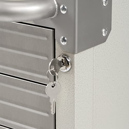 - Heavy-duty stainless steel doors with key lock security. Powder coated steel body