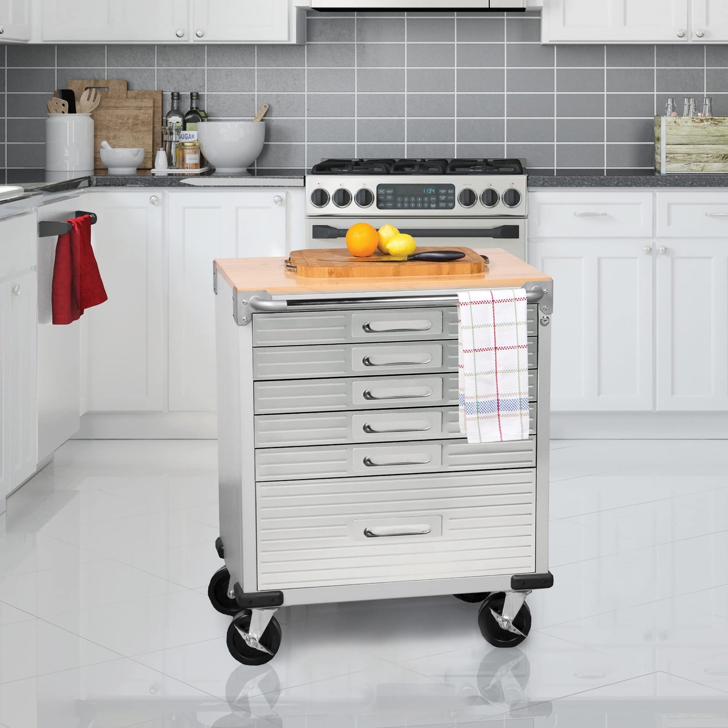 Details: Utility and mobility come together in Seville Classics 6-Drawer Rolling Cabinet. Designed for heavy-duty use, the drawers and panels are constructed from high-quality steel. The 3/4" solid hardwood top is intended for use as a work surface for everyone from home mechanics to professional tradesmen. Includes six drawers with cushioned liners and a locking system (with key) to keep your tools and supplies safe. The included rolling casters allow your equipment to go where you do. A push bar allows the table to act as a ultra heavy-duty wheel cart.