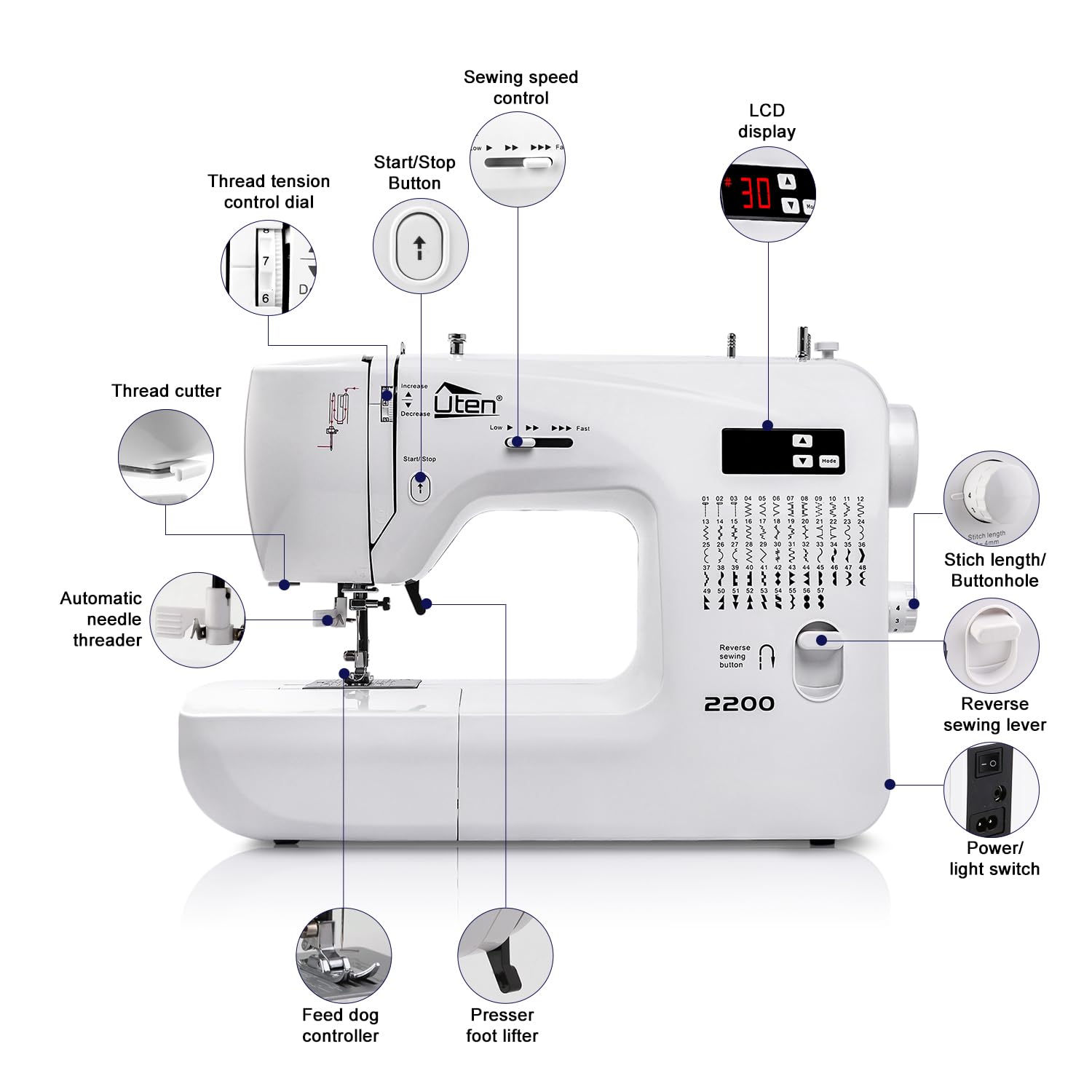 - 【60 Unique Built-in Stitches】: UTEN 2200 SEWING MACHINE have 60 different built-in stitches which contains basic and decorative stitches
