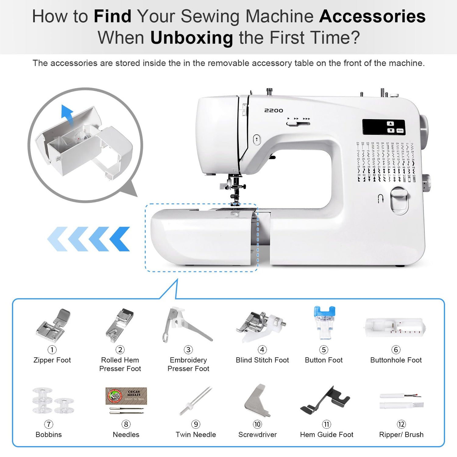 - 【Useful Presser Foot】: This patchwork quilting machine comes packed with 5-quick-change presser feet, including a zigzag foot, a zipper foot, a button foot, a blind stitch foot and a buttonhole foot