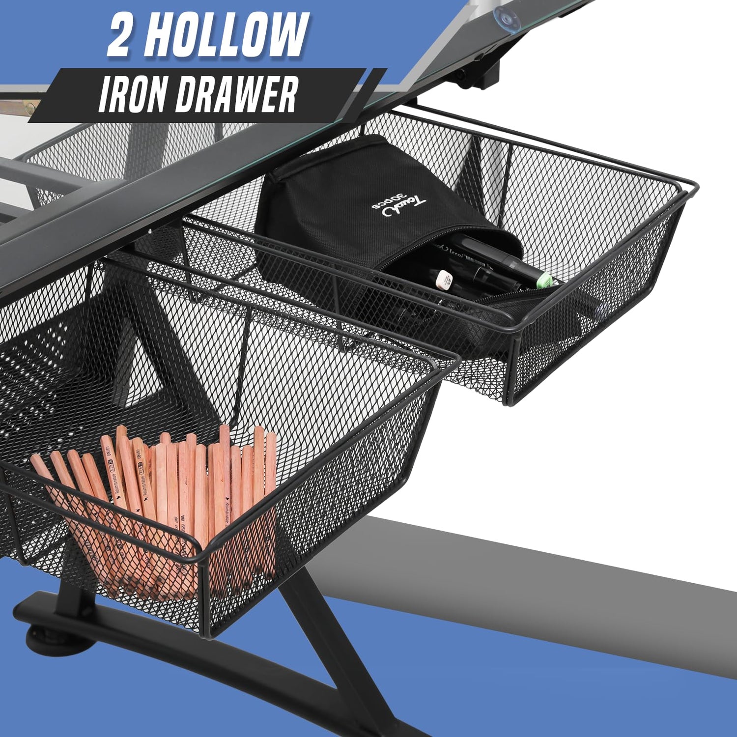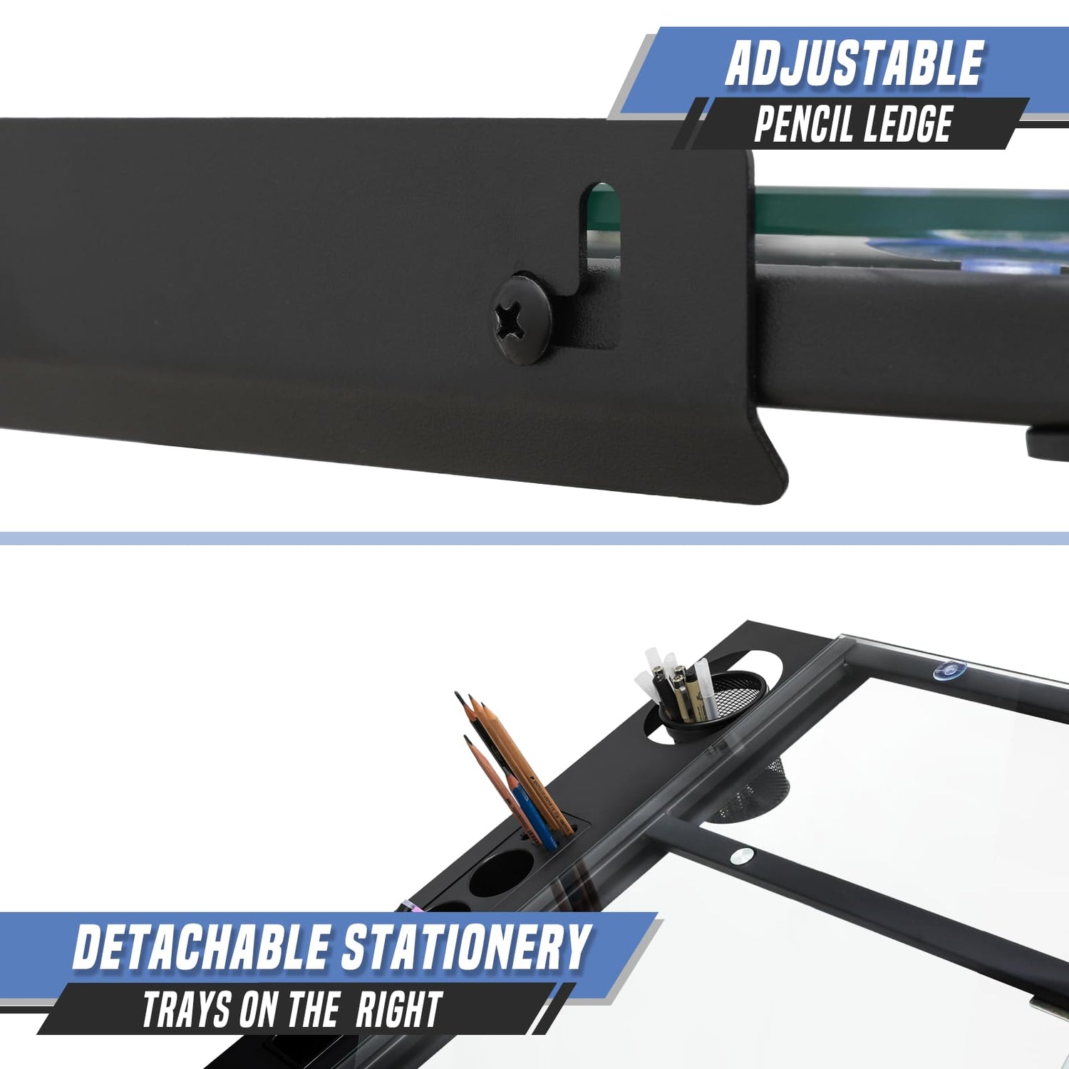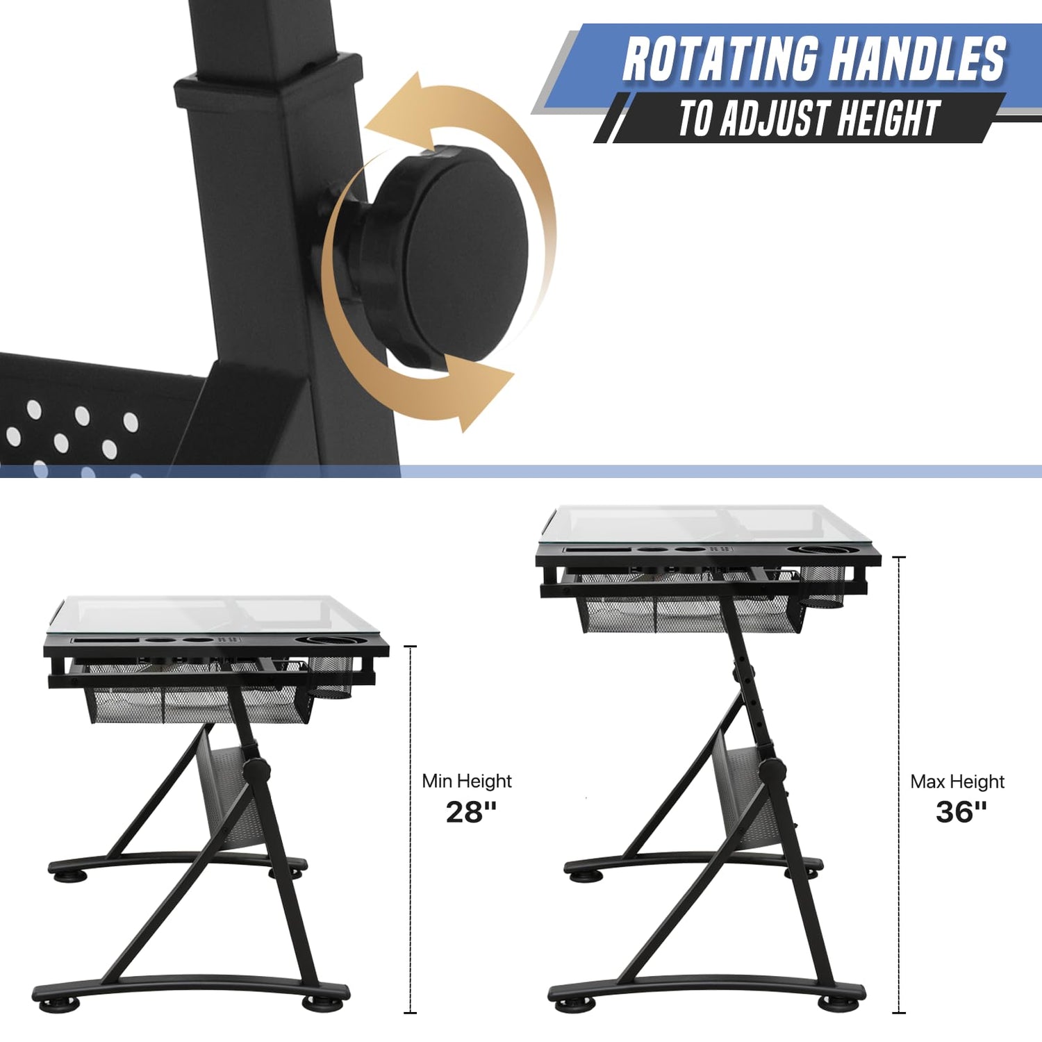 Toughened Glass Desktop - Toughened glass desktop is strong and durable to use. Filleted edges and rounded corners can avoid undesired injury or damage during moving and using; can combine with a light and turn this drafting table into a light table, transparent toughened glass can soften the light, great for tracing and comic creation.
