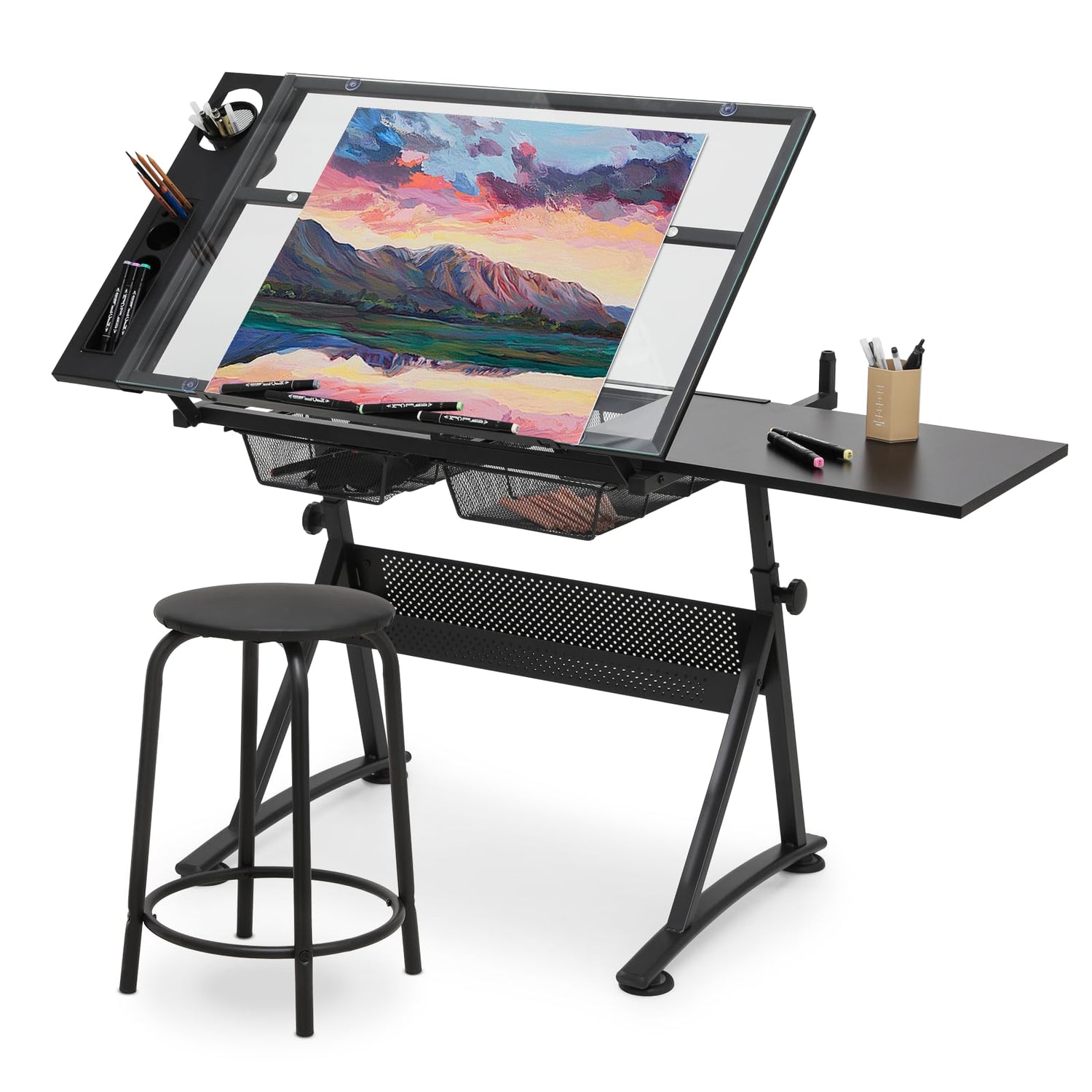 SFIHOME Adjustable Drafting Table & Stool Set, Art Desk with Additional Slide-Out Table Design, Versatile Drawing Table with Storage, for Art, Drafting and Creative Tasks, Black