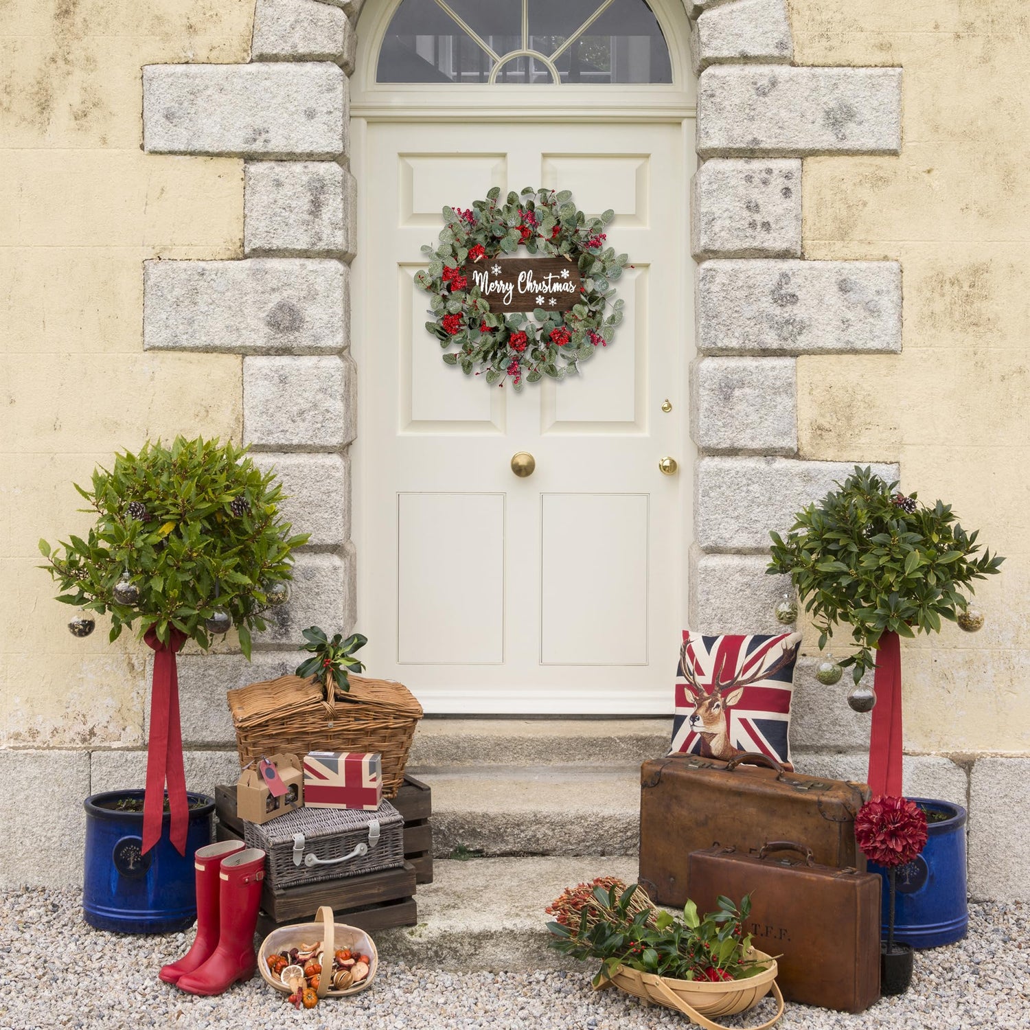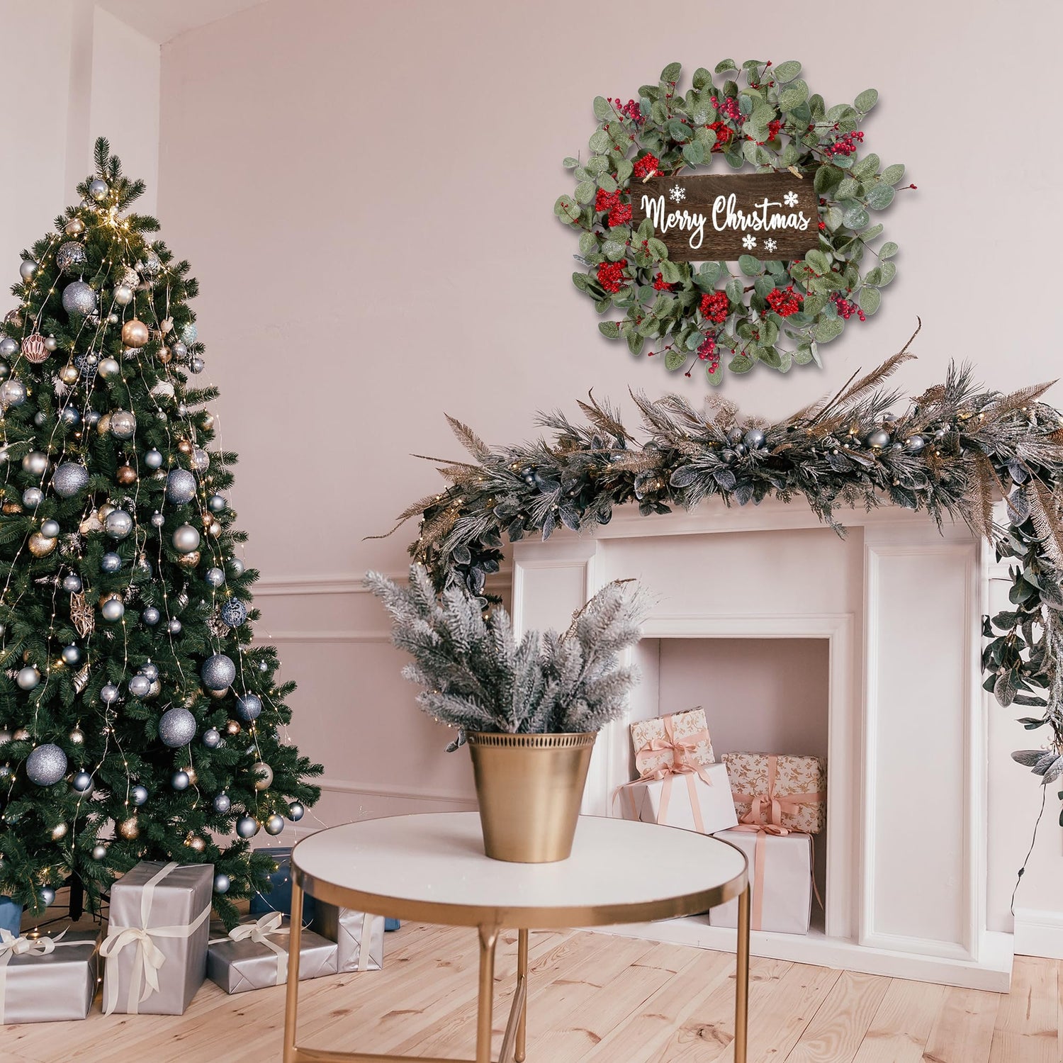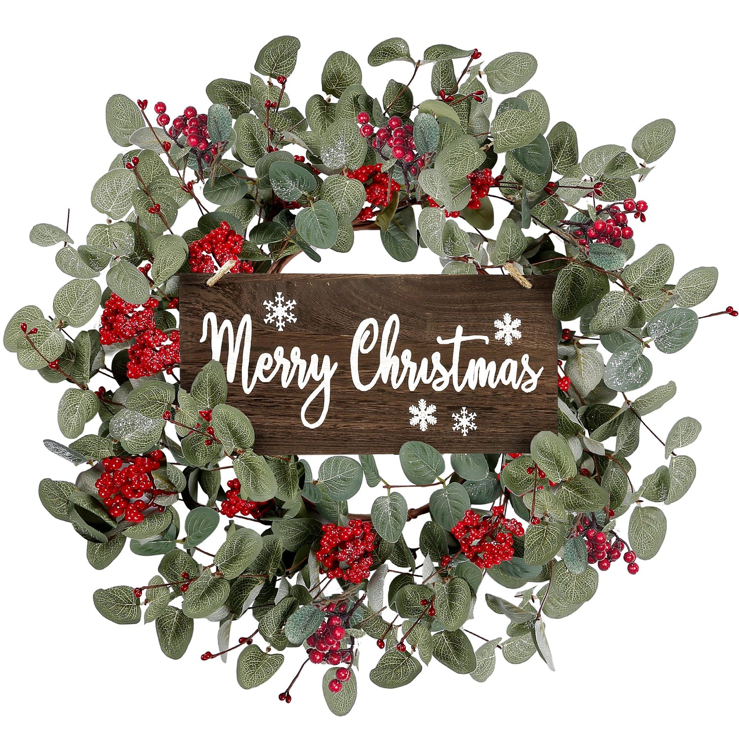 - [HIGH QUALITY WREATH]: This artificial Christmas wreath is made of premium silk and foam full of rich texture. The base is durable natural iron wire with clusters of small red berries and eucalyptus. The entirely realistic wreath is vivid and vibrant.