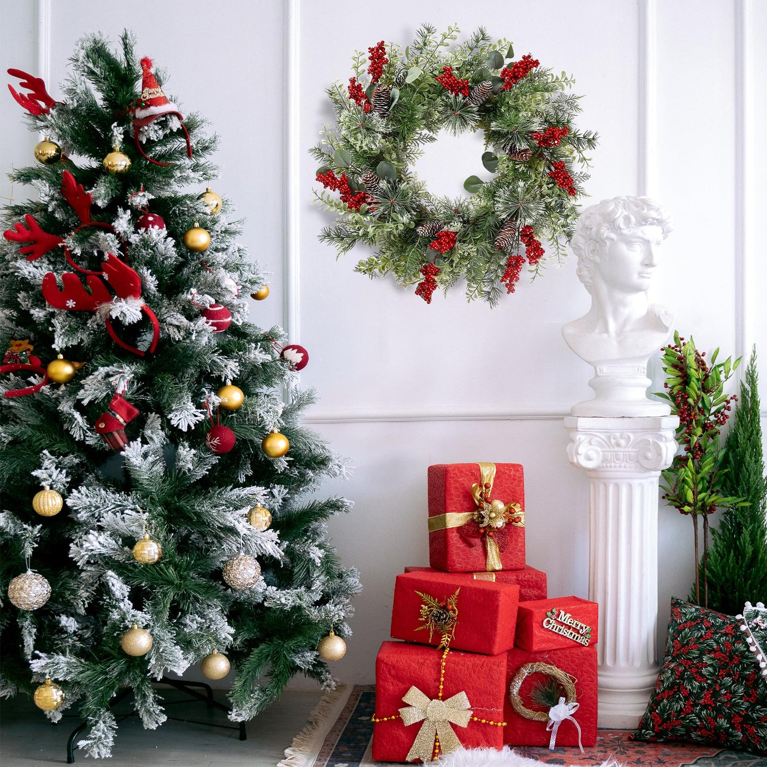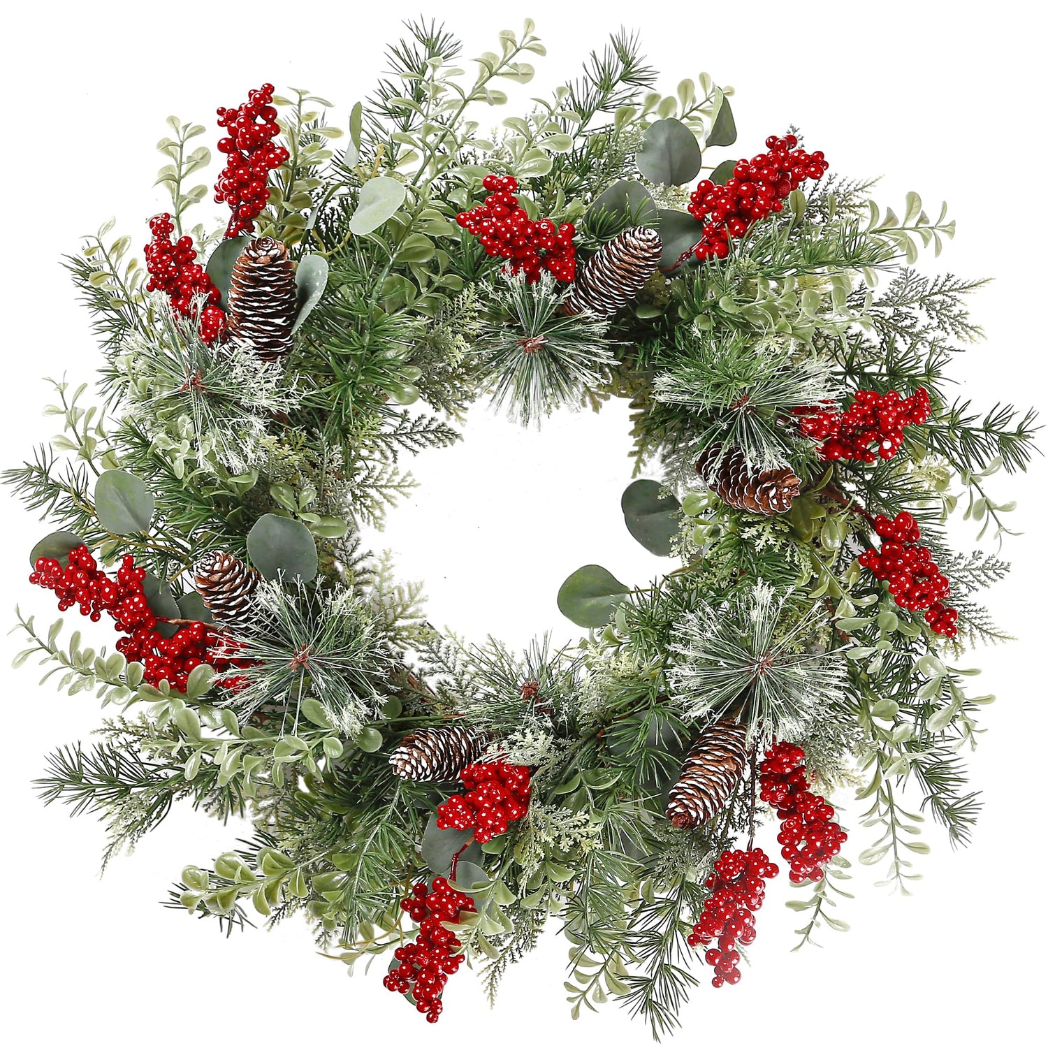 - [HIGH QUALITY WREATH]: This artificial Christmas wreath is made of premium plastic and foam full of rich texture. The base is durable natural grapevine with clusters of small red berries and pine needles. The entirely realistic wreath is vivid and vibrant.