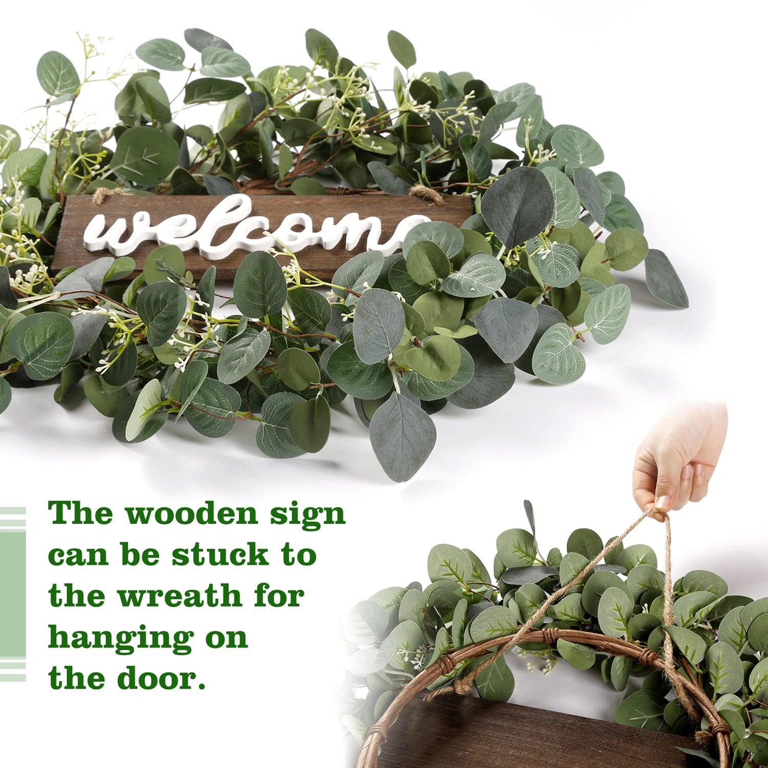 - ATTENTION: The wooden sign is separated from the wreath, but the welcome sign can be stuck to the wreath for easily hanging on the door, please find the last picture for your reference. Please don’t hesitate to contact us if you have any questions, we will try our best to help you!