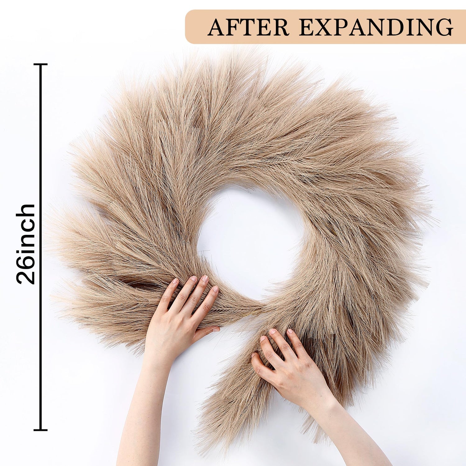 - [PROPER SIZE]: 26 inches after fluffing. Since the wreath is packed in a relatively small PE bag to satisfy transportation requirement, you need to expand the branches and adjust the pampas into best shape and you'll get a 27 inch full wreath of enough size.