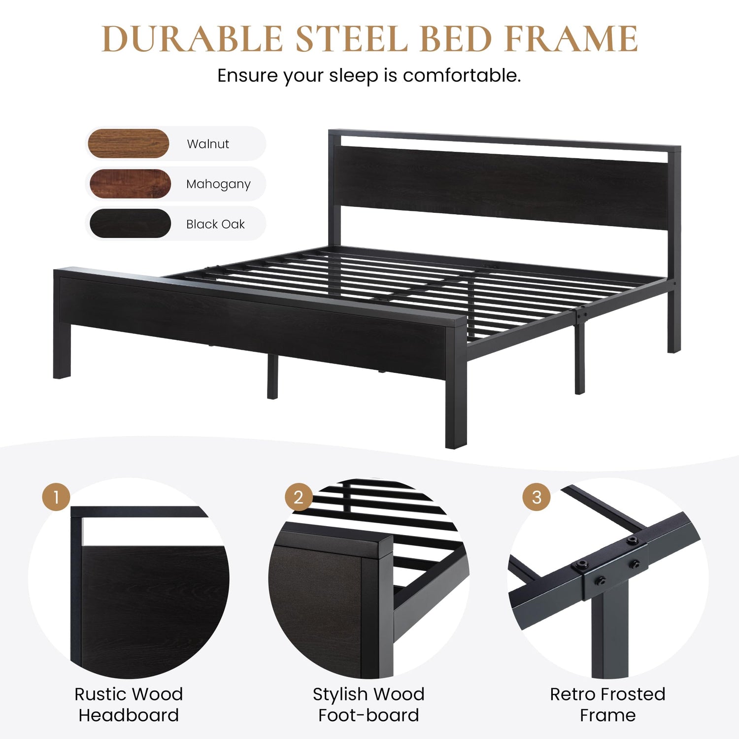 SHA CERLIN 14 Inch King Size Metal Platform Bed Frame with Wooden Headboard and Footboard, Mattress Foundation, No Box Spring Needed, Large Under Bed Storage, Black Oak