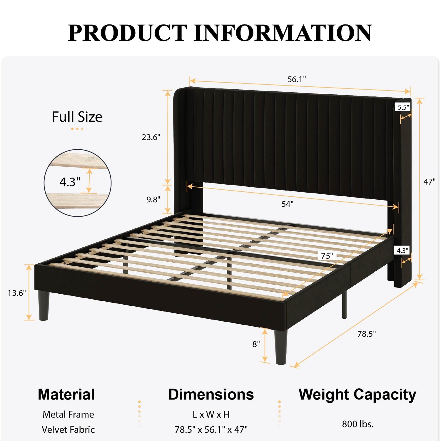 SHA CERLIN Full Size Velvet Bed Frame with Vertical Channel Tufted Wingback Headboard, Upholstered Platform Bed with Wood Slats, No Box Spring Needed, Easy Assembly, Black