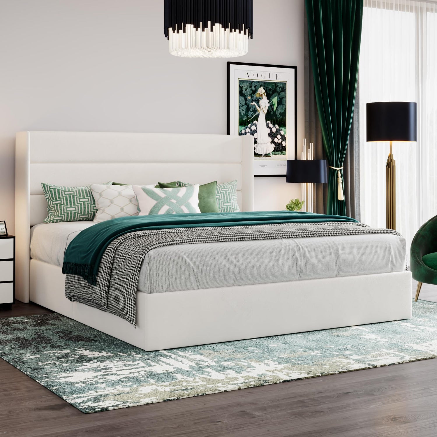 SHA CERLIN King Size Lift Up Storage Bed/Velvet Upholstered/Modern Wingback Headboard/Upholstered Platform Bed Frame/Hydraulic Storage/No Box Spring Needed/White