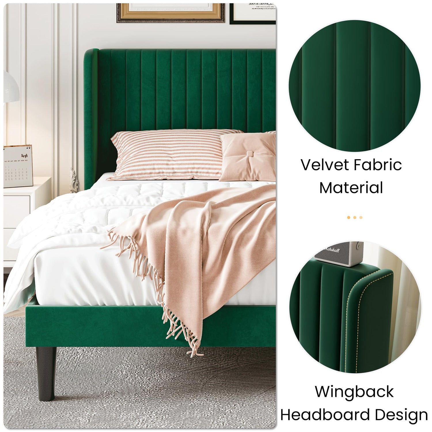- Modern Wingback Headboard: The bed frame is beautifully upholstered in soft velvet and features a wingback headboard design, adds a stylish touch of glamour to any home decor