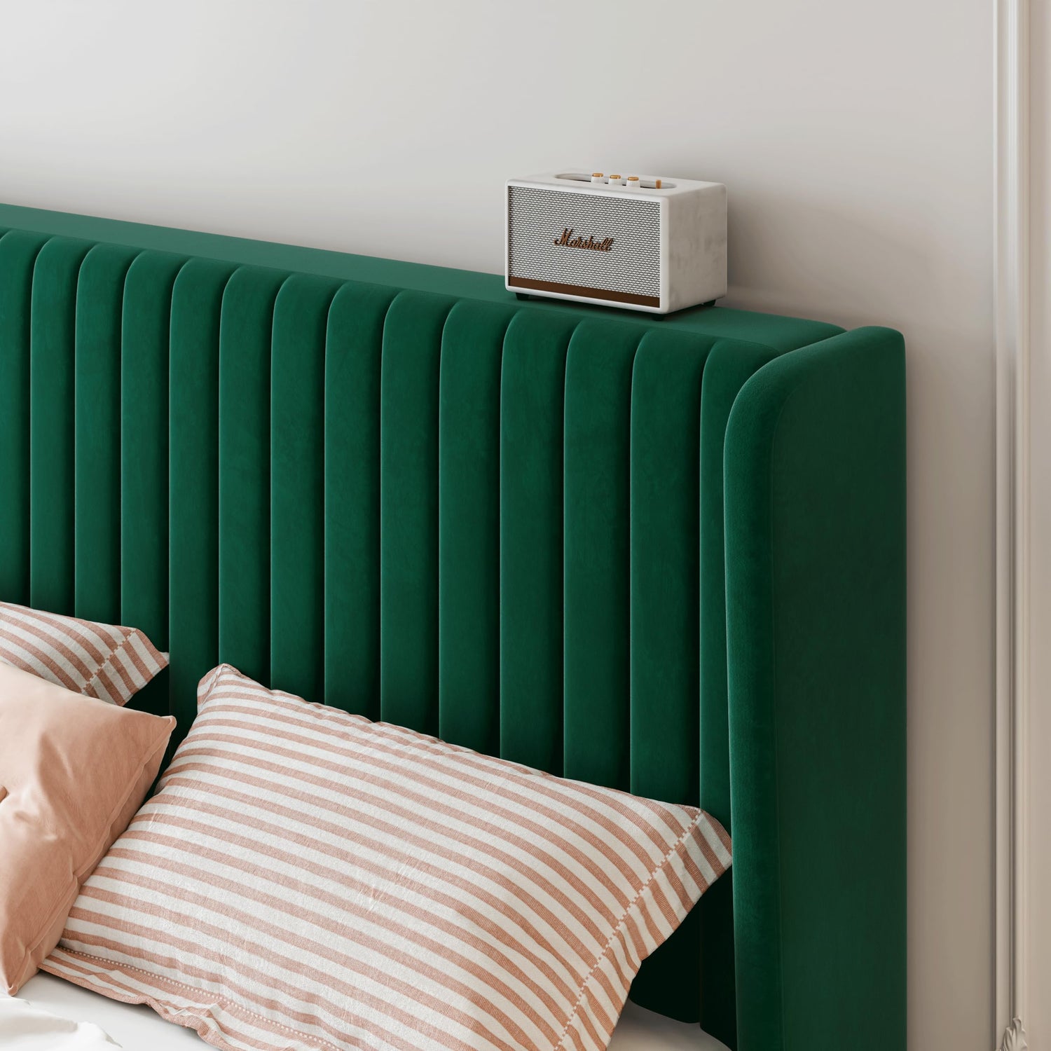 SHA CERLIN King Size Velvet Bed Frame with Vertical Channel Tufted Wingback Headboard, Upholstered Platform Bed with Wood Slats, No Box Spring Needed, Easy Assembly, Green