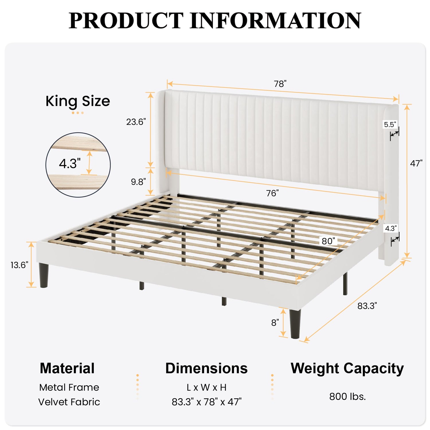SHA CERLIN King Size Velvet Bed Frame with Vertical Channel Tufted Wingback Headboard, Upholstered Platform Bed with Wood Slats, No Box Spring Needed, Easy Assembly, White