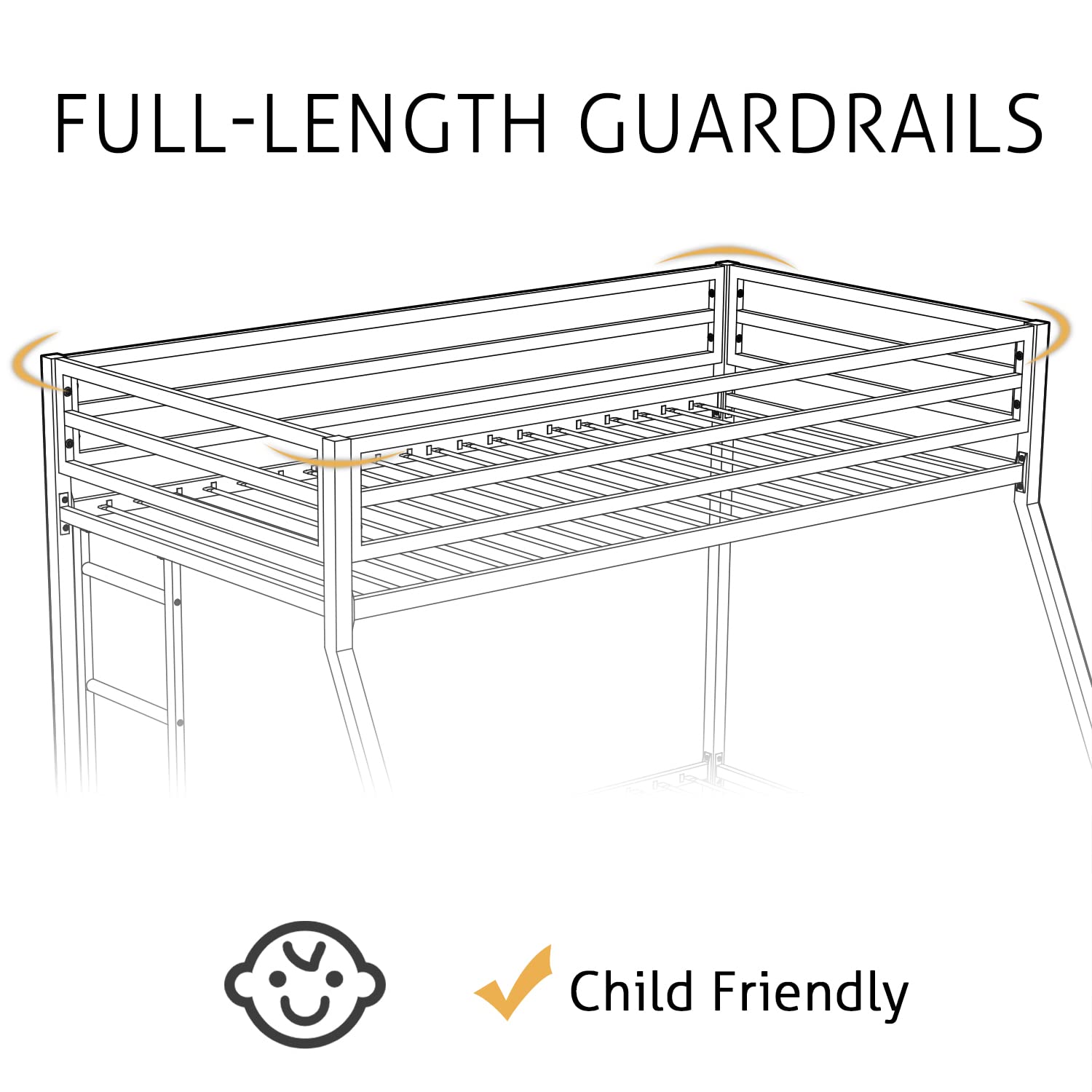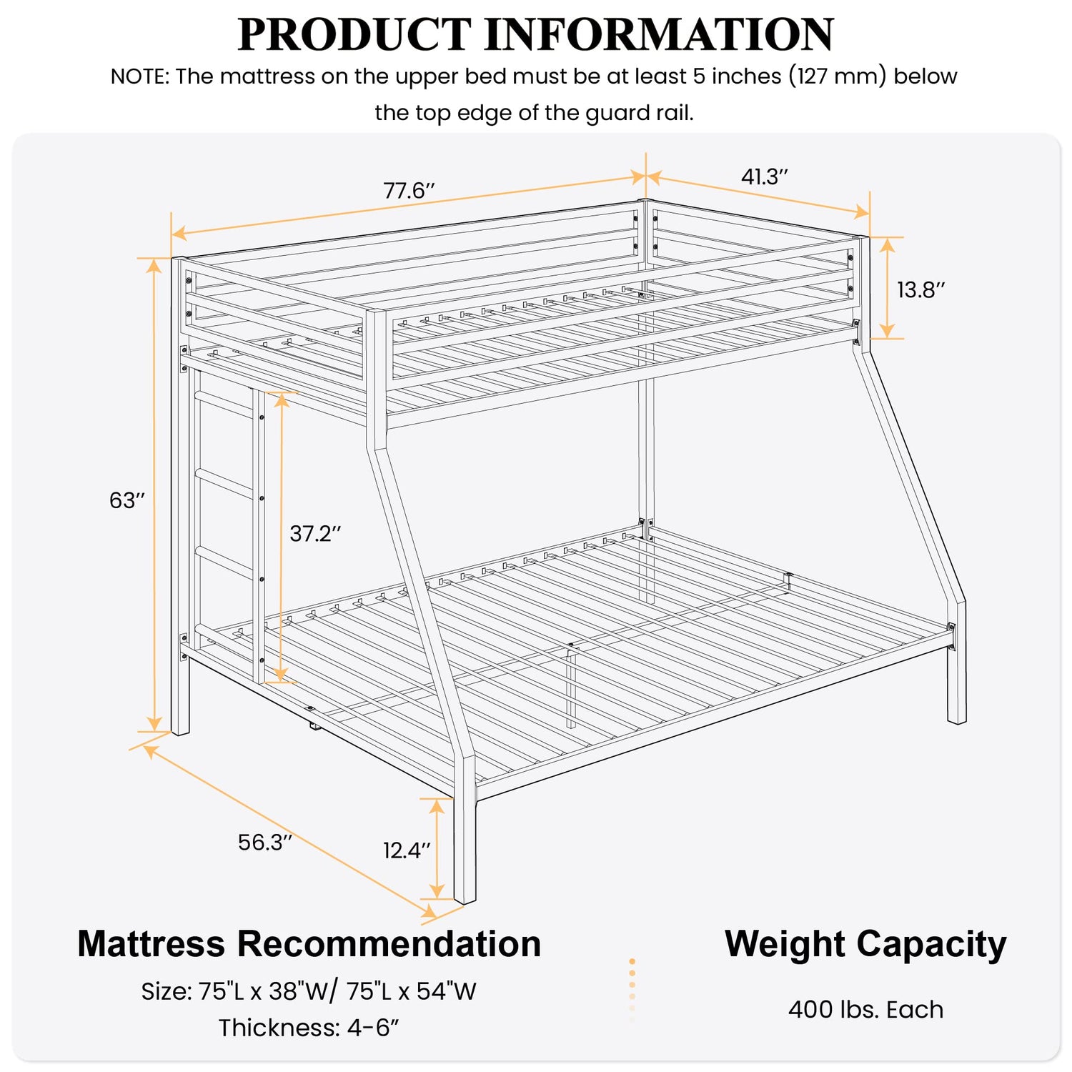 Ensure your safety by following the guideline that the upper mattress should sit at least 5 inches below the guard rail. Create a stylish and practical sleeping solution with the SHA CERLIN Twin Over Full Metal Bunk Bed, where comfort meets convenience.