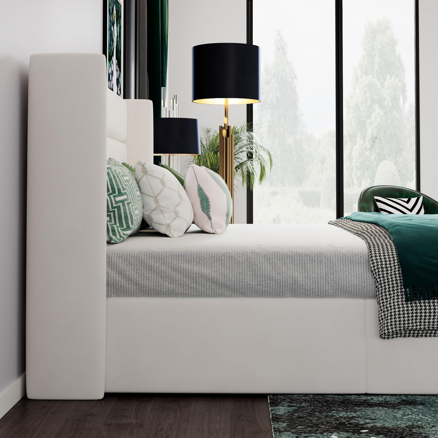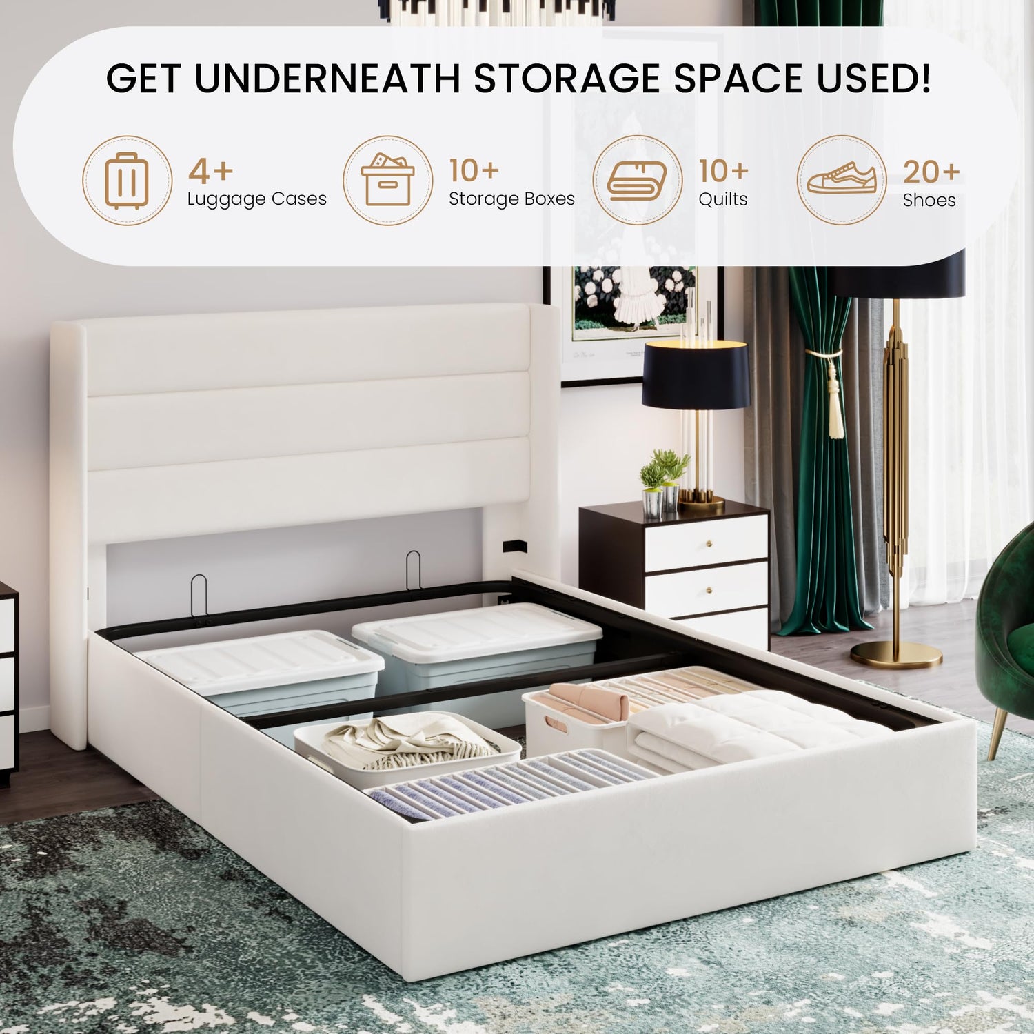 SHA CERLIN Queen Size Lift Up Storage Bed/Velvet Upholstered/Modern Wingback Headboard/Upholstered Platform Bed Frame/Hydraulic Storage/No Box Spring Needed/White