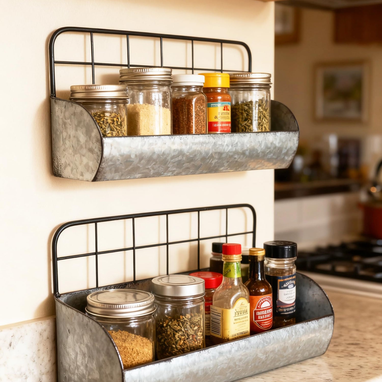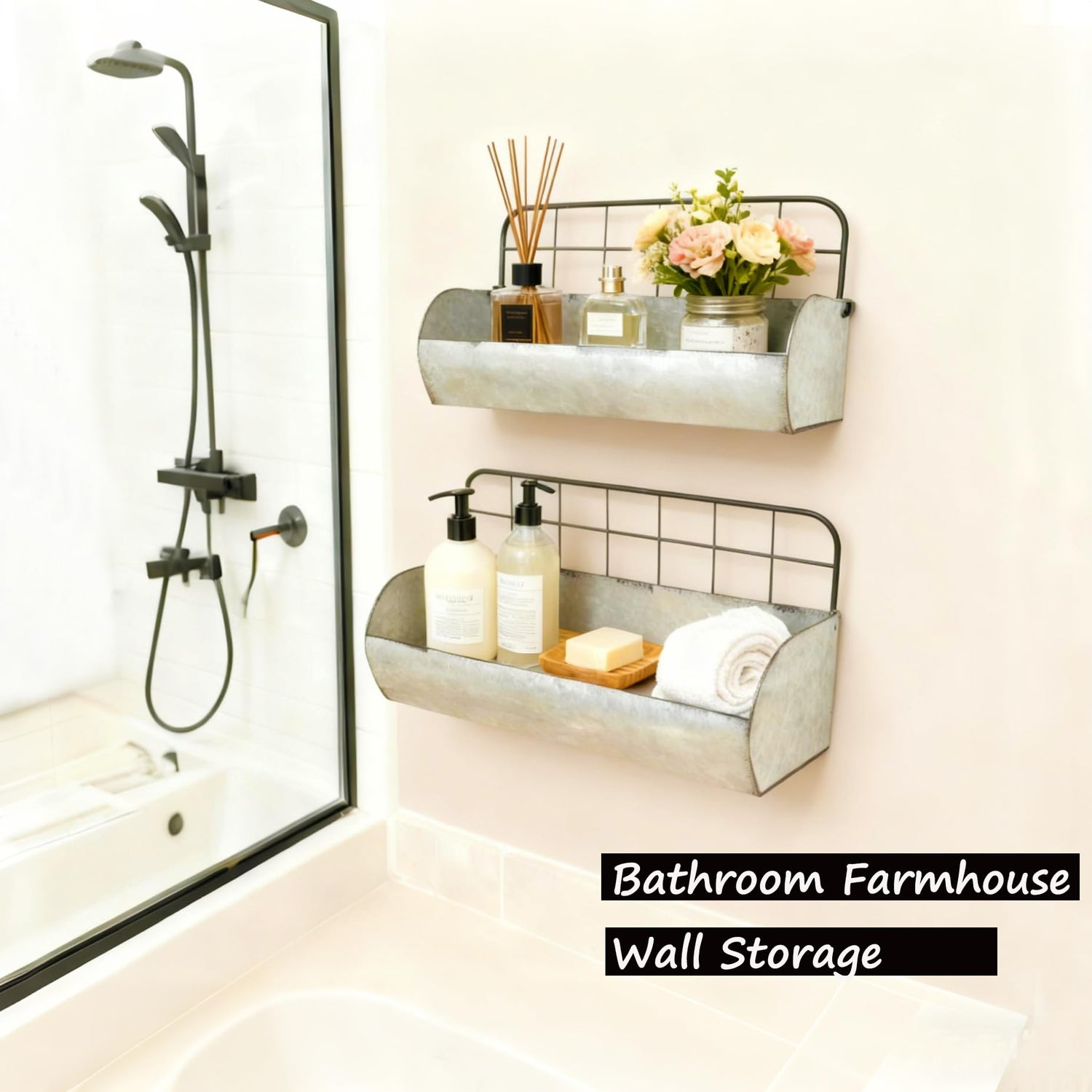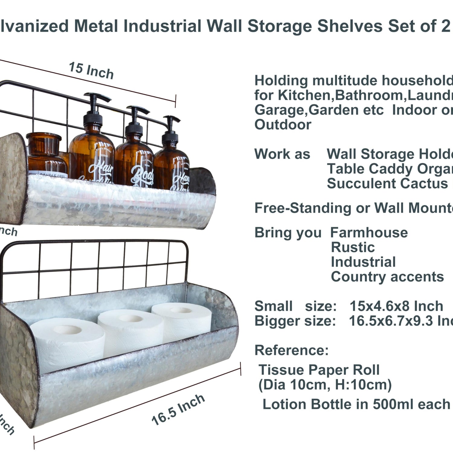 - Galvanized hanging wall shelves, metal bin hold a multitude farmhouse home decor from Bathroom,Kitchen,Laundry room. Hanging Tin shelves place hand towels, hold toilet paper or even a mason jar, multipurpose as farmhouse bathroom shelves. In kitchen,it works metal wall basket storage for spice bottle or its supplies. In living room store decorative piece for wall shelf. Industrial look with storage bins for herb/succulent planter, especially decorated fake flowers for farmhouse centerpiece decor