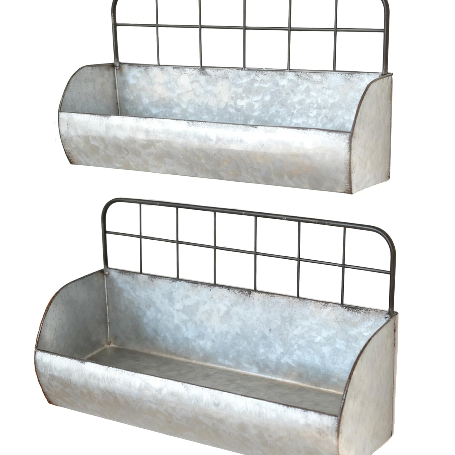 - Sturdy Galvanized metal panel with wire lines hanger, hanging wire basket mounts to the wall with 2 hanger or screws, easy as wall floating shelves. Distressed Vintage metal wall shelves are flat bottom can sit on itself to keep your counter tops out of clutter. Great for tabletop caddy organizer or wall hanging basket