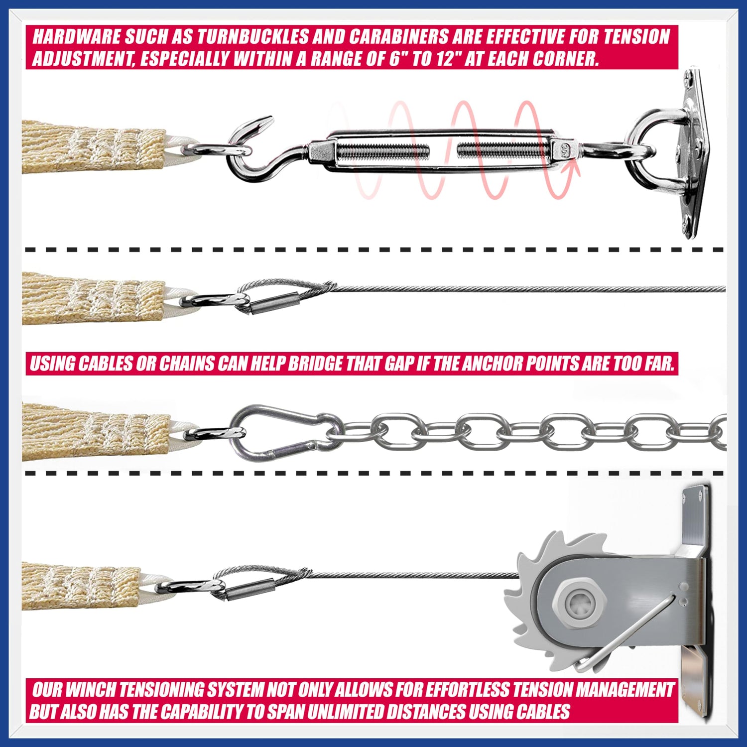 - ★【Premium HDPE Material and Reinforced Design 】: Fabric is made of woven HDPE ( High Density Polyethylene), corner D rings are made of stainless steel, which are attached to the heavy duty white webbing surrounding the perimeter.