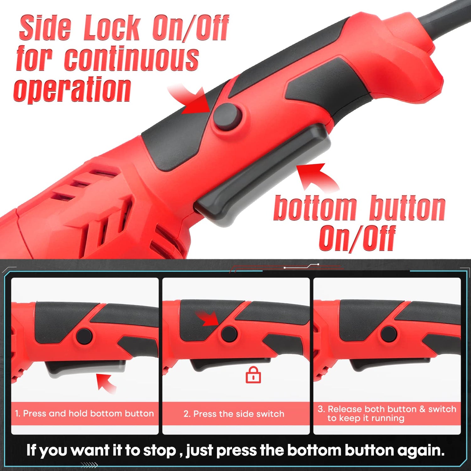 - Safety & Convenience Design : It comes with 2 different types of Tool-Free wheel guards specifically designed to protect the users during cutting, grinding & polishing; Additionally, the side switch has a lock-off/on feature for easy operation and the raised spindle lock makes it easy and safe to change its accessories
