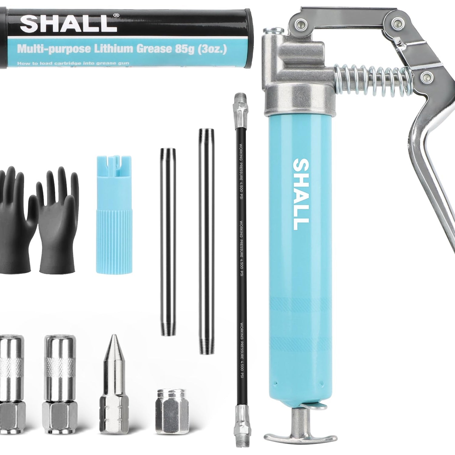 SHALL Mini Grease Gun, Small Grease Gun Kit (3.52OZ Capacity, 3000PSI) with 2PCS 4-Jaw couplers, Sharp Nozzle, Extension Adapter, 3OZ Cartridge Grease, Reinforced PVC Glove & Zerk Fitting Cleaner