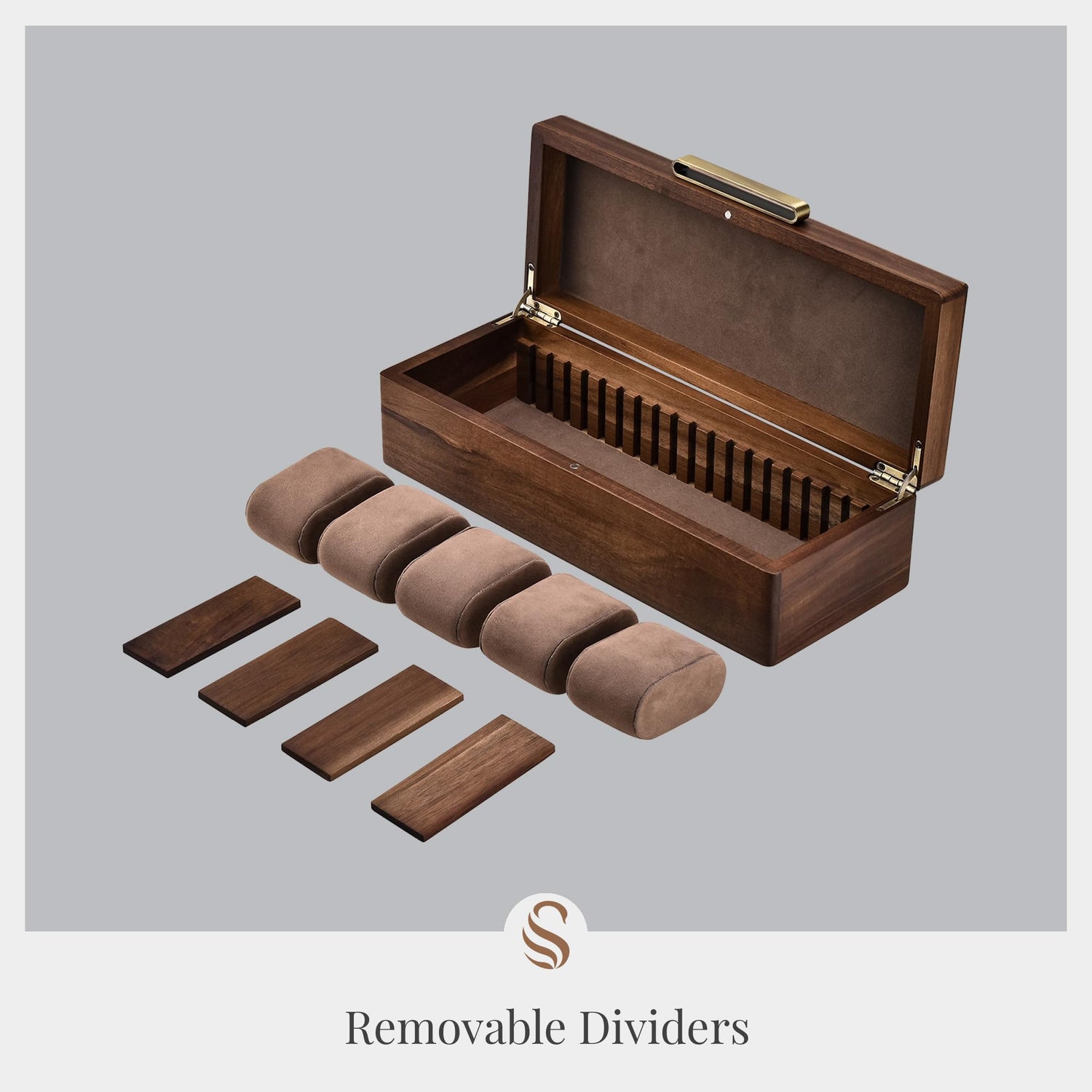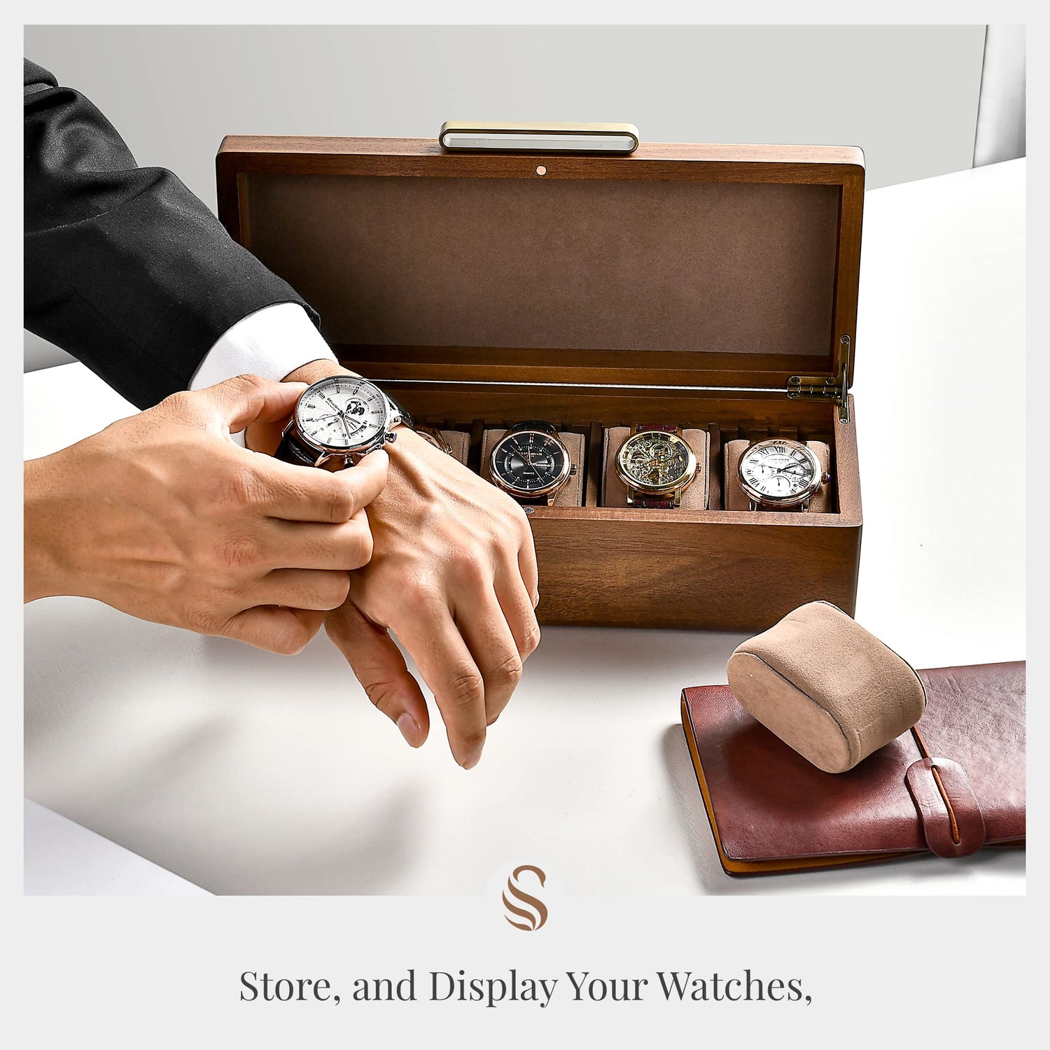 - PREMIUM QUALITY: Made of highly durable and natural Acacia wood, the Shanik watch box is a well-crafted and luxury organizer that will serve you for ages. Being covered with smooth and soft velvet inside, it’s easy to clean and pleasant to the touch.