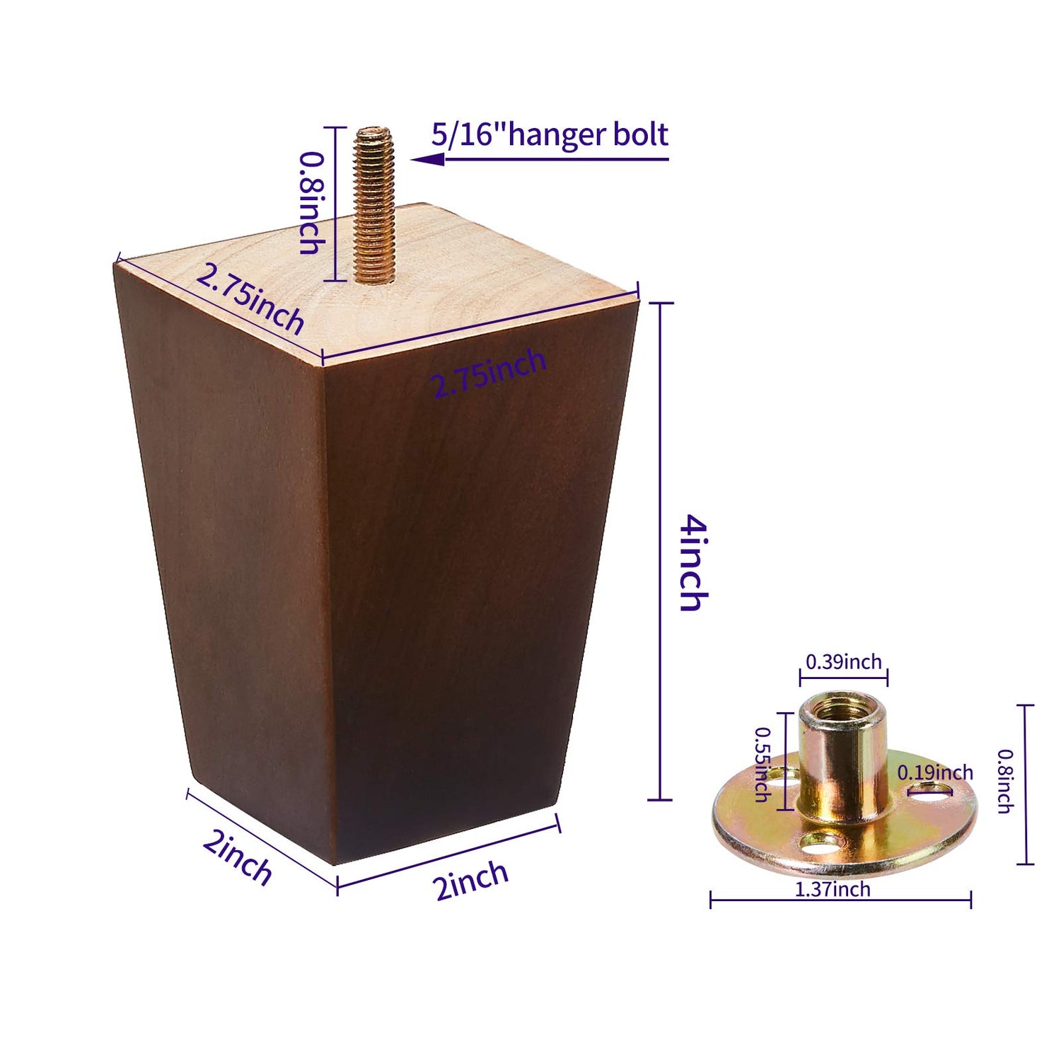 • ✔【Easy to Install】Each package includes 4 pcs 4 inch wooden feet and 4 set 0.3 inch (M8) US standard 5/16" hanger bolts.All the accessories are complete, just simply connect, install and tighten the screws to use.It is very easy to replace old furniture feet and install them new.
