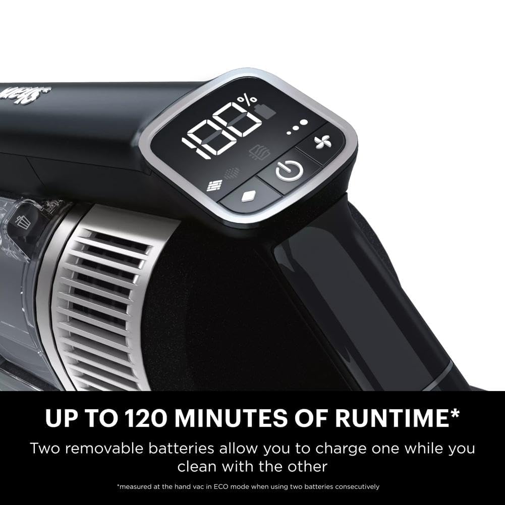 - UP TO 120 MINUTES OF RUNTIME: Two removable batteries for a combined total of up to 120 minutes of runtime (measured at the hand vac in ECO mode when using two batteries consecutively).