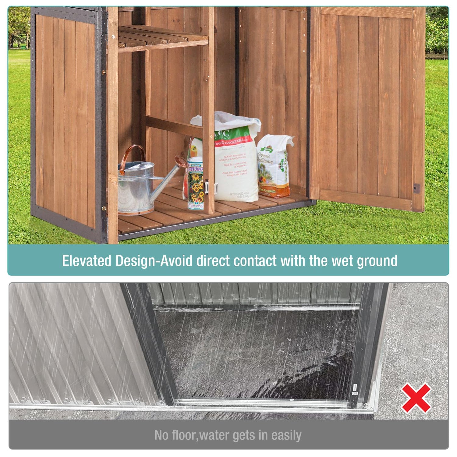 - Waterproof Design: The garden storage tool shed features a sloping roof to prevent water pooling and an elevated wooden floor to avoid water ingress, ensuring dry and safe storage.