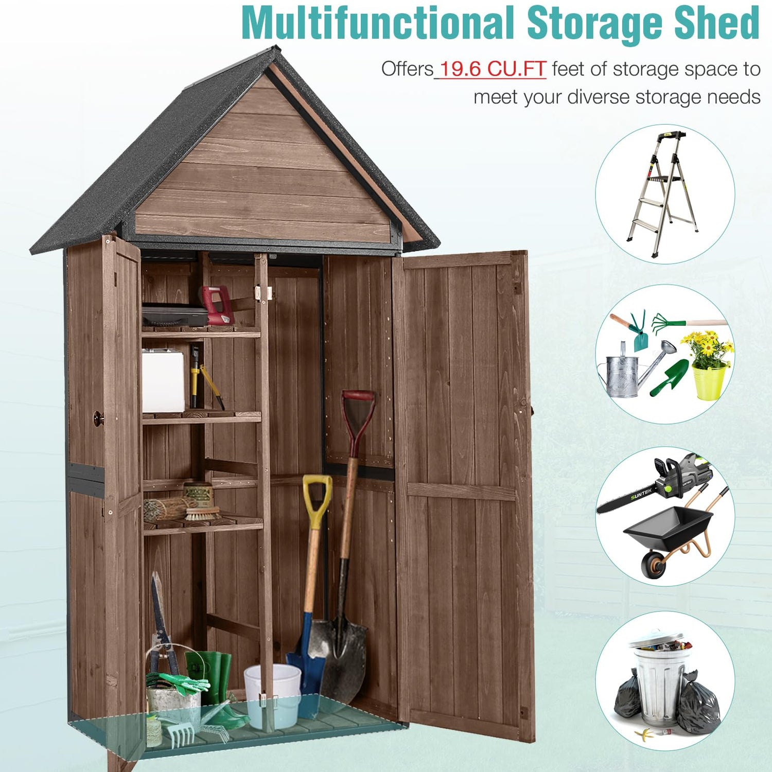 - Adjustable Shelves: The outdoor storage cabinet comes with three-tiered shelves and a large space for long tool storage, providing abundant storage to tuck away your tools and keep your area looking tidy. Plus, the shelves can be effortlessly dismantled to accommodate larger tools like brooms and mops, catering to your evolving needs.
