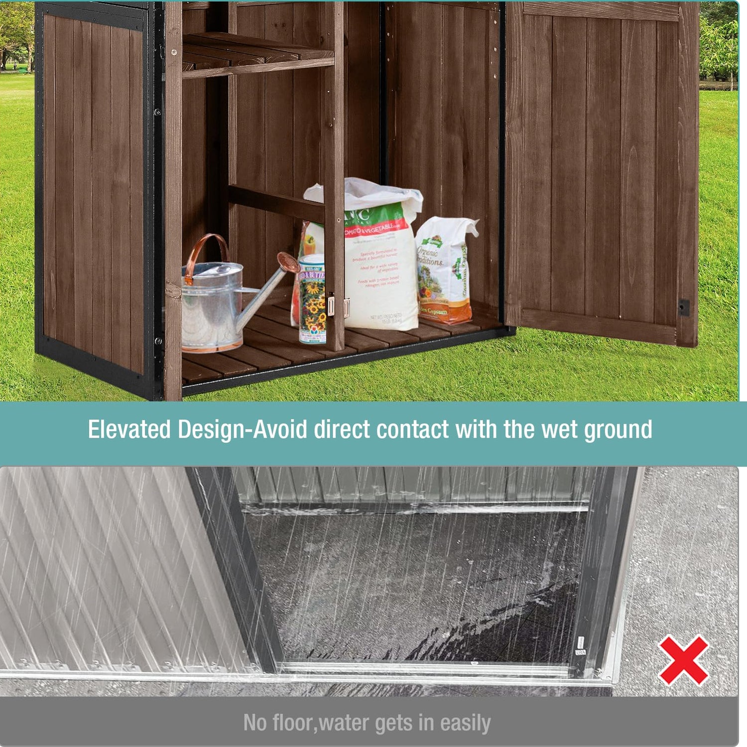 - Waterproof Design: The garden storage tool shed features a sloping roof to prevent water pooling and an elevated wooden floor to avoid water ingress, ensuring dry and safe storage.