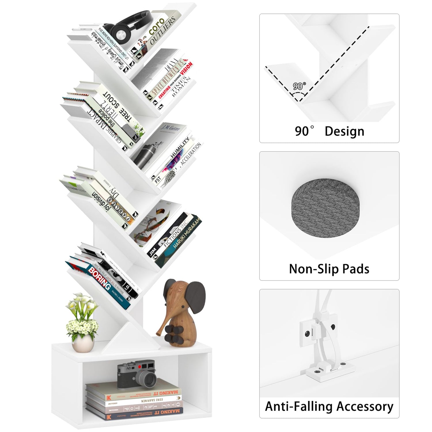 - [Anti-Tip Design for Added Safety] This bookshelf features an all-wood, 10-shelf tree-shaped cabinet design, as well as an anti-tip design that ensures its stability and durability. It's 100% safe for homes with children or pets.