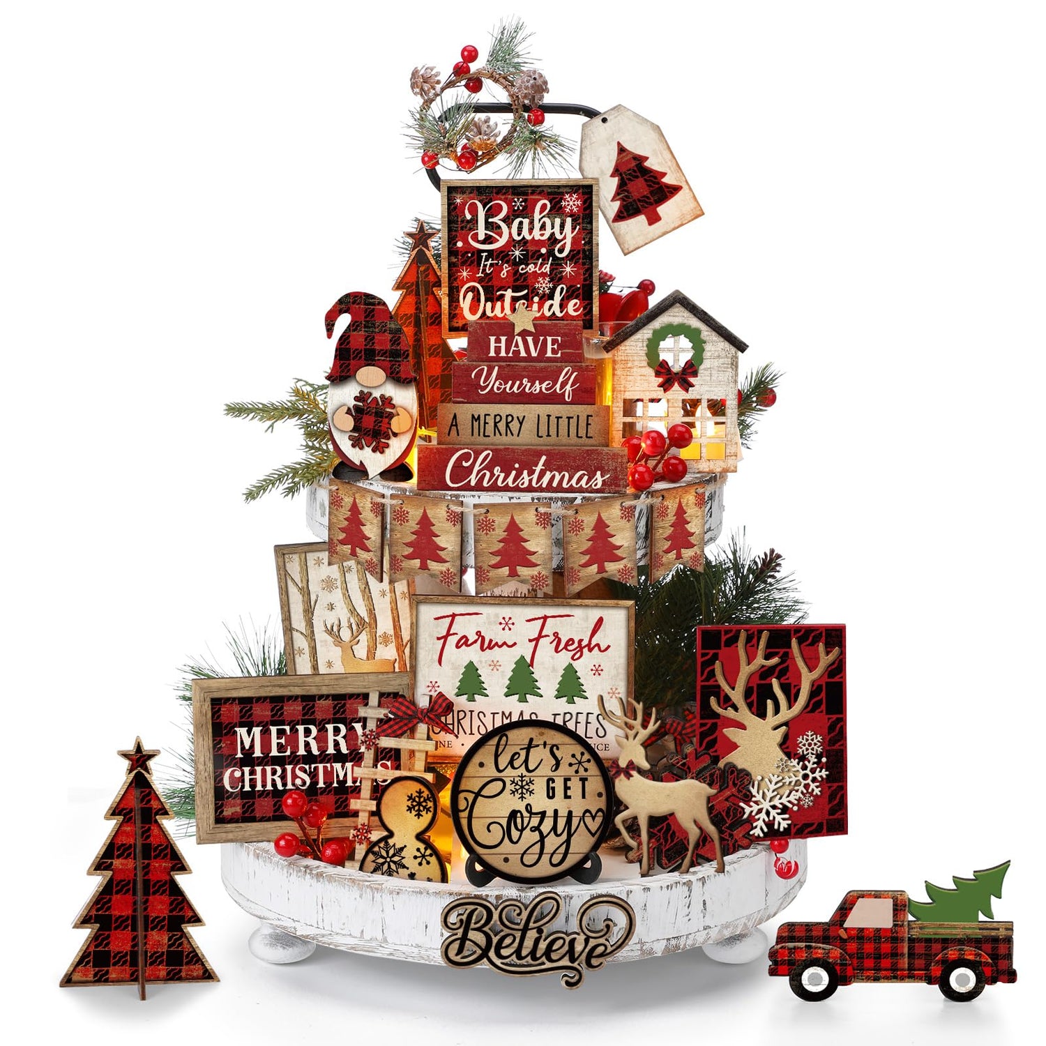 Shellwei 24 Pcs Christmas Tiered Tray Decor Wood Rustic Christmas Decoration for Home Table Shelf Christmas Winter Farmhouse Decor Xmas Trees Gnome Elk Snowflake Wooden Signs Buffalo Plaid Table Decor