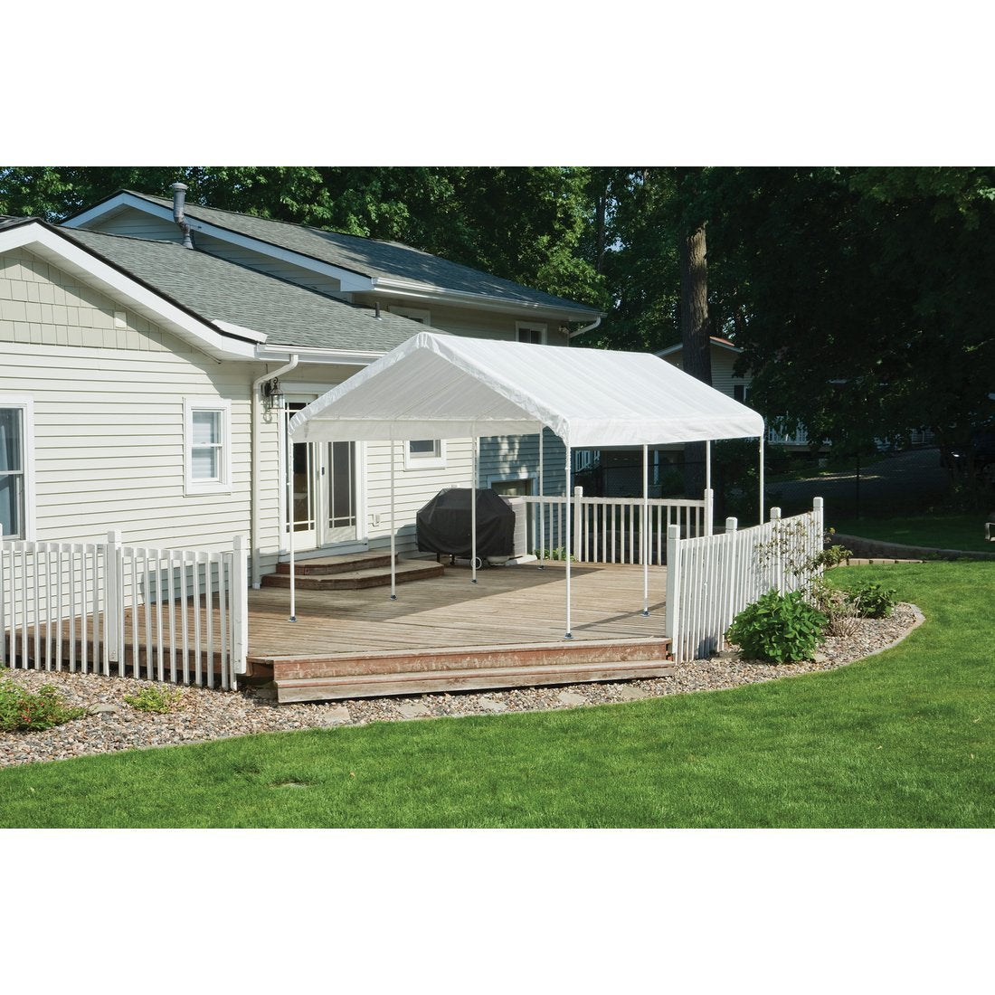 Details: The ShelterLogic MaxAP 10 x 20-foot Canopy is the ideal seasonal shade solution for decks, patios, or backyards. Made from an all-steel metal frame that is 1-3/8 inches, the MaxAP Canopy is tough and durable. The metal frame is constructed with a premium powder-coated finish that prevents rust and corrosion. Wide metal foot plates on every leg add support and easy access to secure anchor points. The patented Twist-Tite tensioning system lines up the frame and tightens down the cover to ensure a secure, more stable shelter. Includes durable, high density woven nylon shock cord bungees that provide strength and stability when attaching the cover. With a strong, durable cover made from a thick, 5 ounce polyethylene ripstop material, the MaxAP Canopy is the outdoor storage solution you need. The cover is waterproof and also treated with 50+ UPF protection and blocks 98% of the sun's harmful UV rays. The MaxAP outdoor canopy is designed for use in every season and can protect your equipment from sunlight, rain, tree sap, snow, wind and more. The cover is UV-treated inside and out with added faded blockers that results in a fabric cover that withstands the elements. The MaxAP Canopy is great for camping, picnic areas, backyard events, pool areas, commercial job sites, the beach, and many more outdoor activities. Two people are recommended for assembly. With a 1-year limited warranty, you can be confident in the quality of your purchase. Assembled Dimensions: 10' x 20' x 9.5' Assembled Interior Dimensions: 9'9" x 19'9" x 9'5" Purchase Includes: (1) Steel Frame (1) White Cover (1) Pack of Bungee Cords (4) Temporary Spike Anchors (4) Foot Plates Easy Step-by-Step Instructions