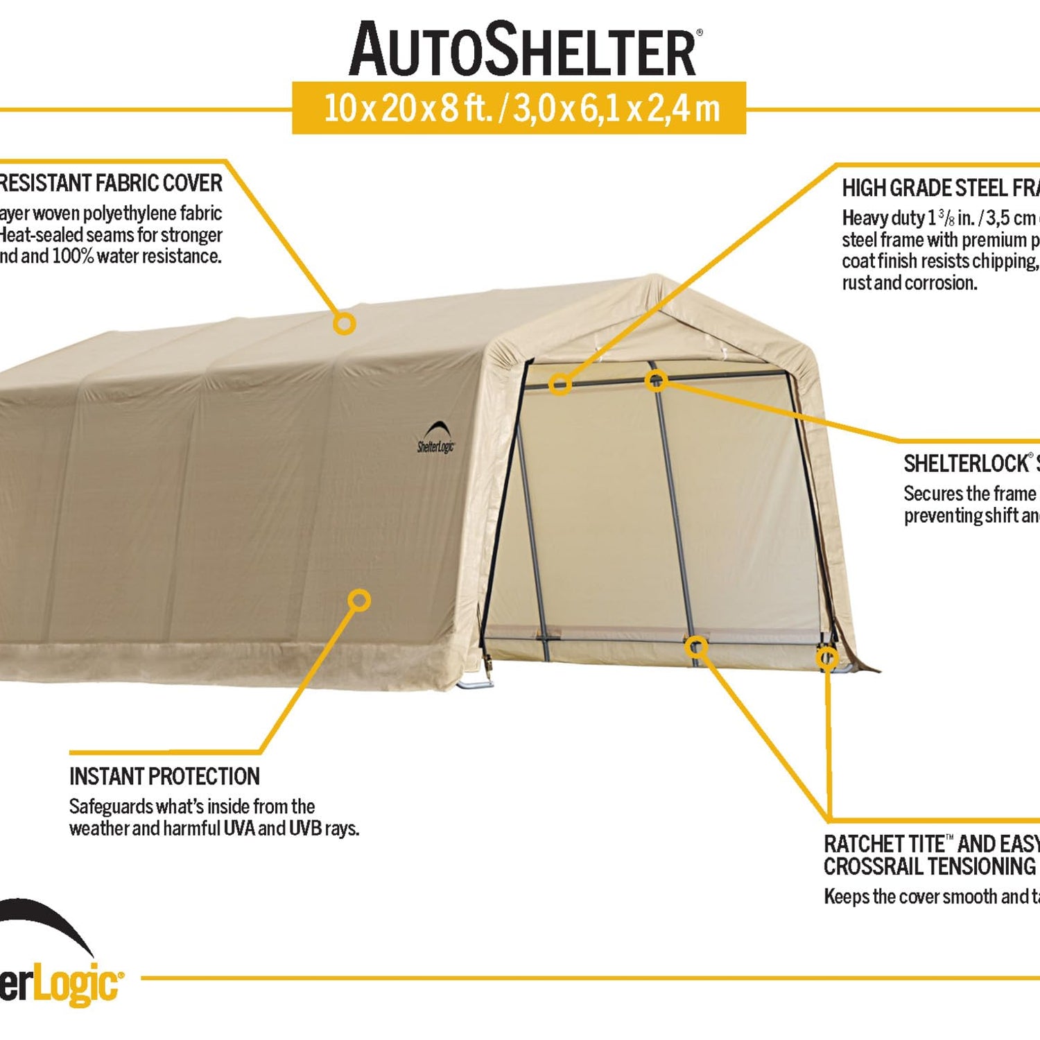 Measuring 10 feet by 20 feet, the AutoShelter from ShelterLogic provides great cover for your cars, motorcycles, ATVs, trailers, lawn and garden equipment, tractors, snowmobiles, or other vehicles or gear.