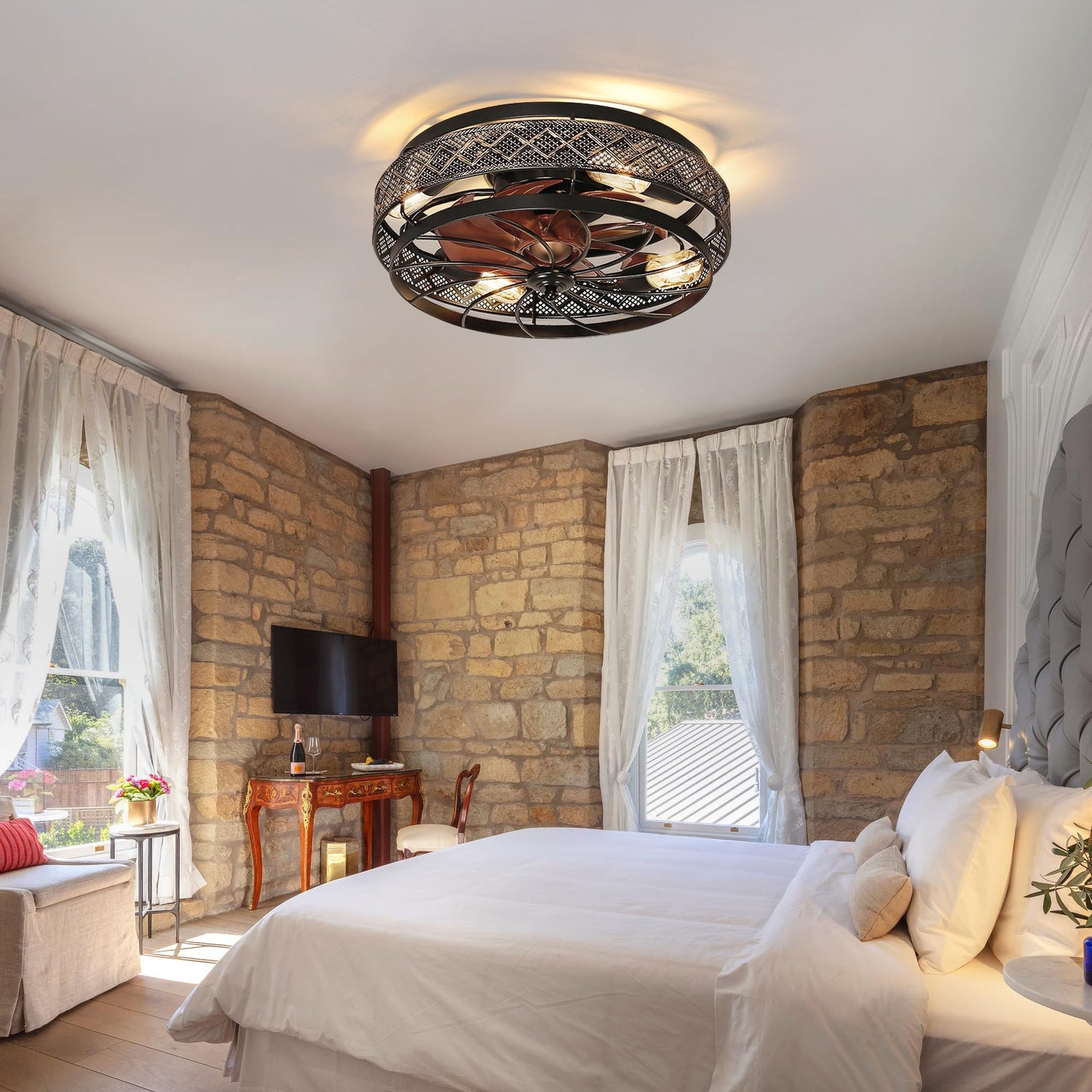 SHIHOT Low Profile Caged Ceiling Fans with Lights and Remote, Flush Mount Ceiling Fan with Light, Bedroom Fan, Small Industrial Black Ceiling Light Fixture, Reversible(Bulbs not Included)