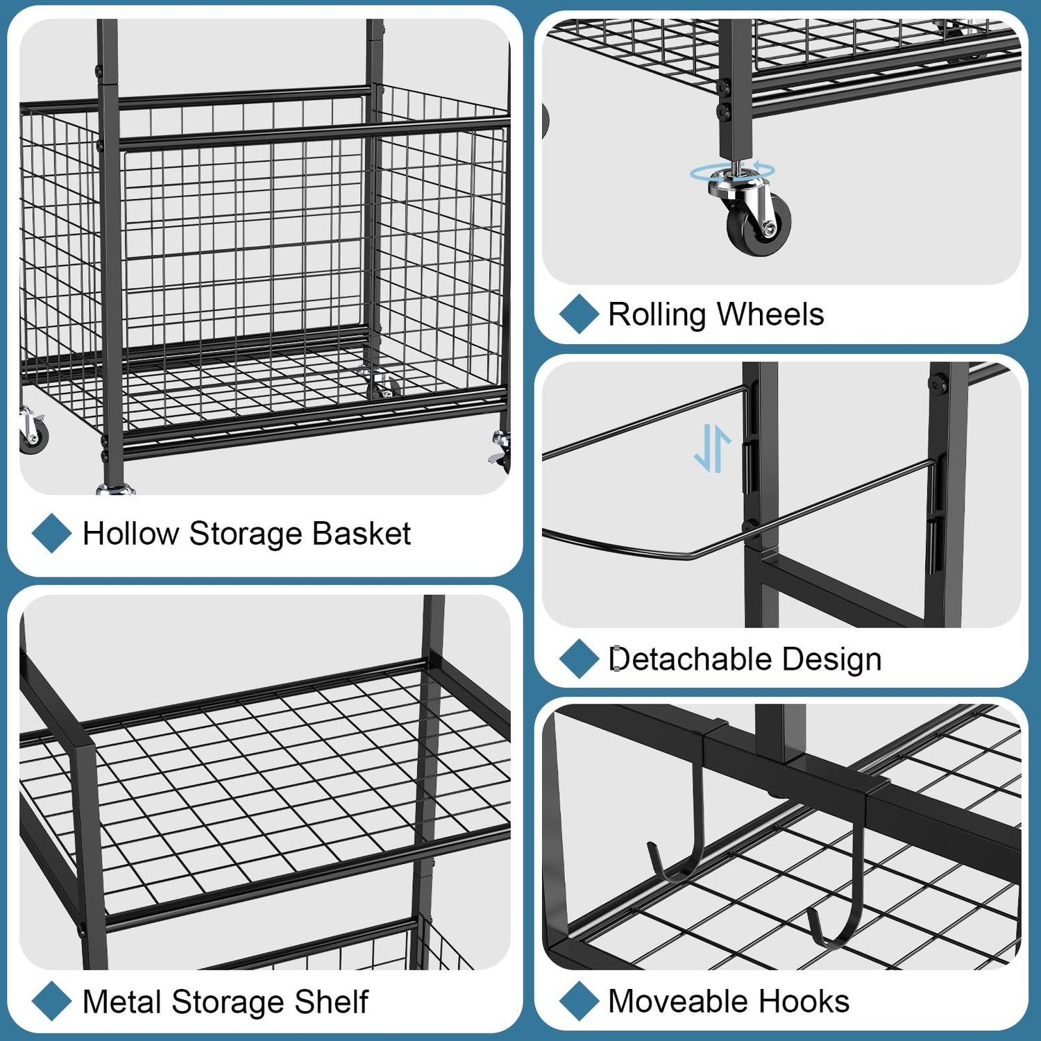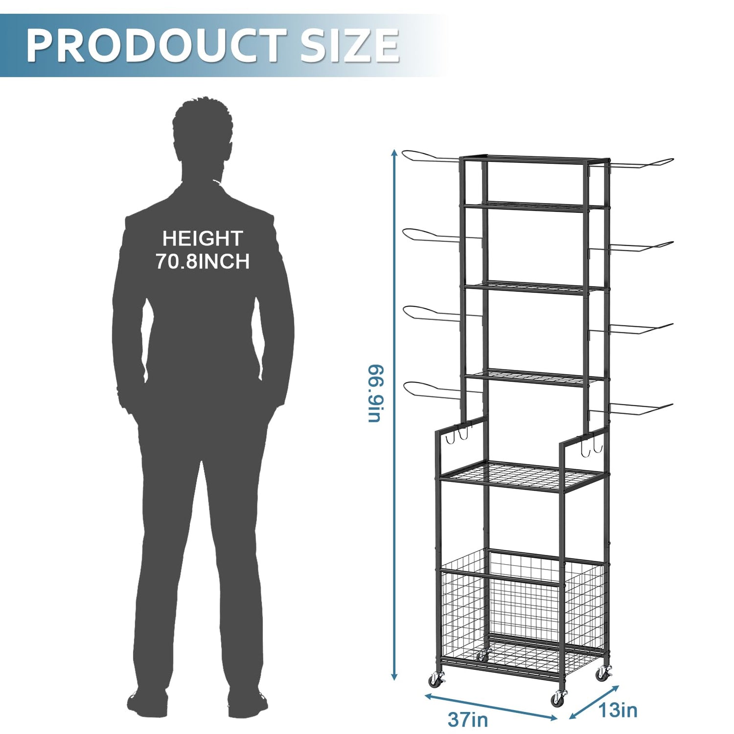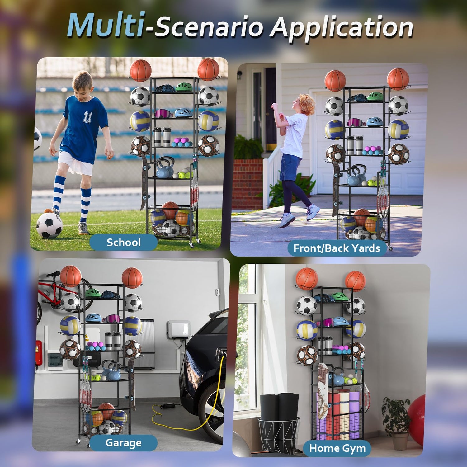 Shinoske Ball Storage Rack with Wheels,6-Tier Basketball Rack with Storage Basket and Hooks,Multi Use Garage Sports Equipment Organizer,for Sports Gear,Volleyball,Football,Indoor/Outdoor Use,Black