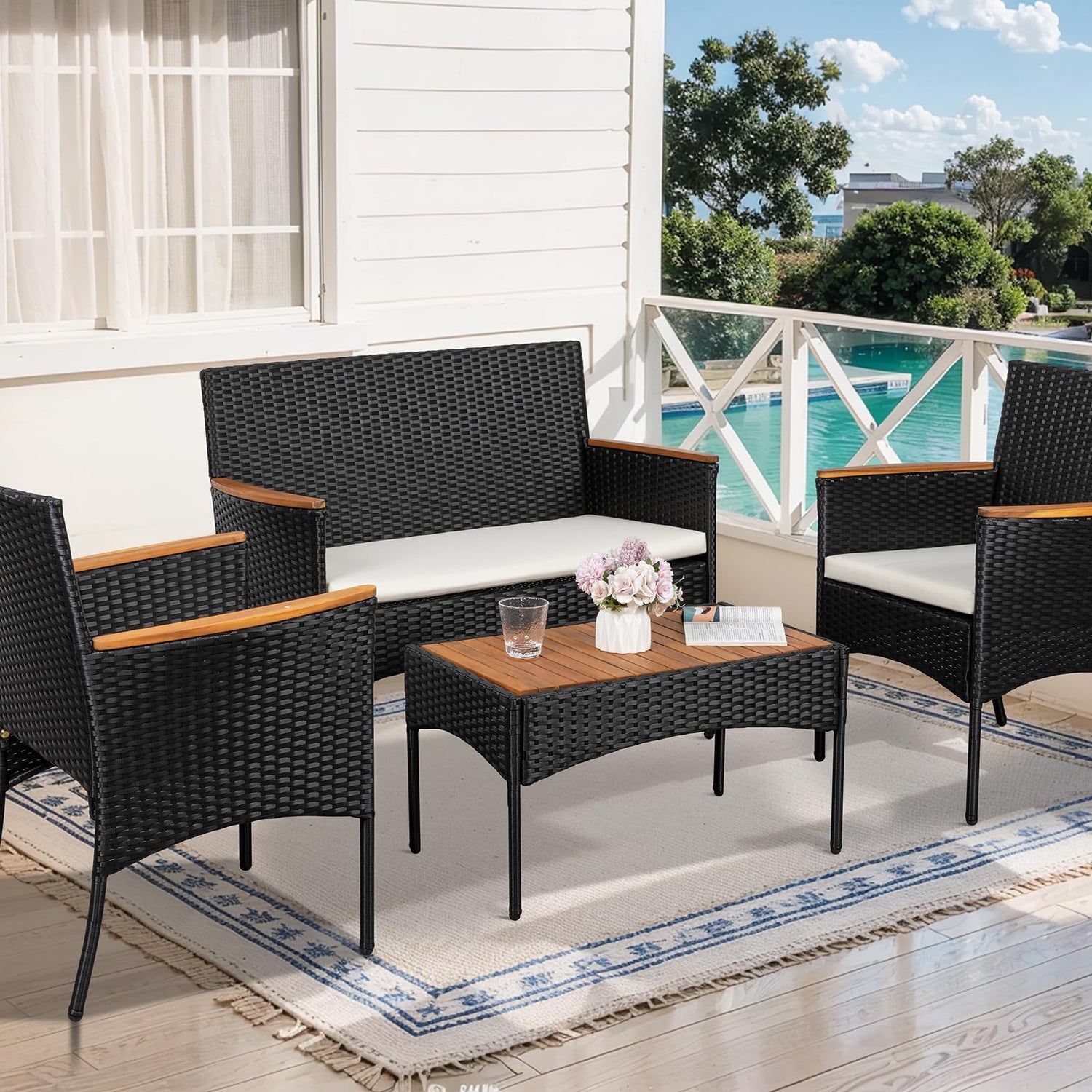 Shintenchi 4-Piece Patio Furniture Set, Outdoor Wicker Patio Conversation Furniture Set with Cushions and Wooden Tabletop for Paito Lawn Backyard, White Cushion