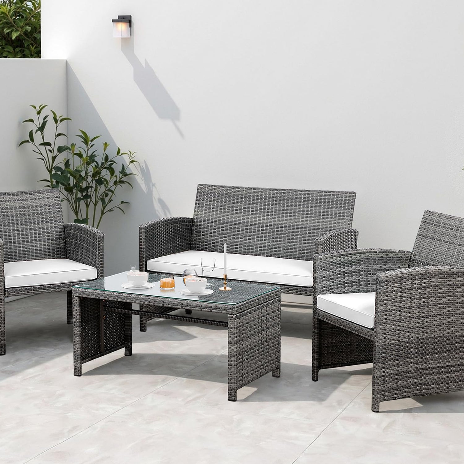 Shintenchi 4 Piece Patio Ratten Set Outdoor Furniture Set Wicker Conversation Set with Cushions and Tempered Glass Tabletop,Beige