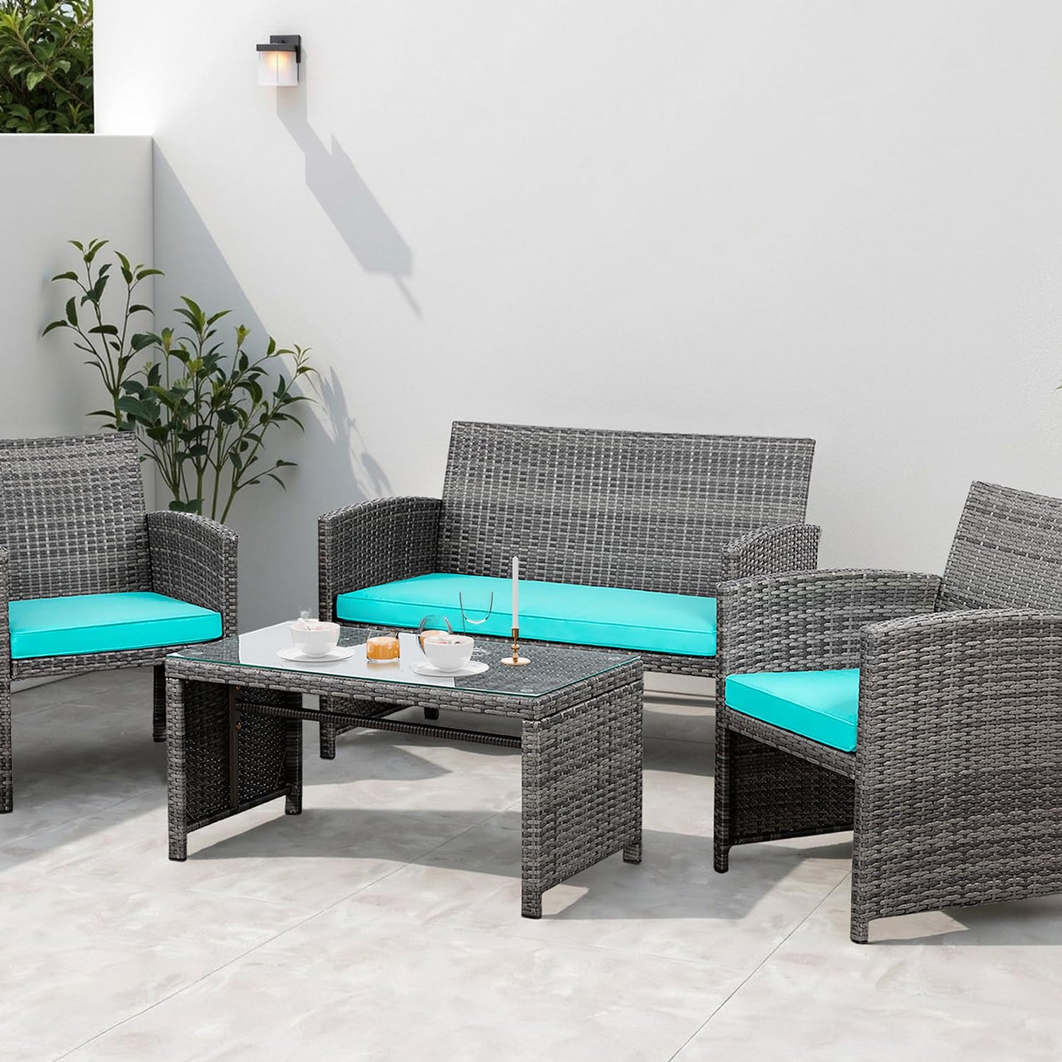 Shintenchi 4 Piece Patio Ratten Set Outdoor Furniture Set Wicker Conversation Set with Cushions and Tempered Glass Tabletop,Blue