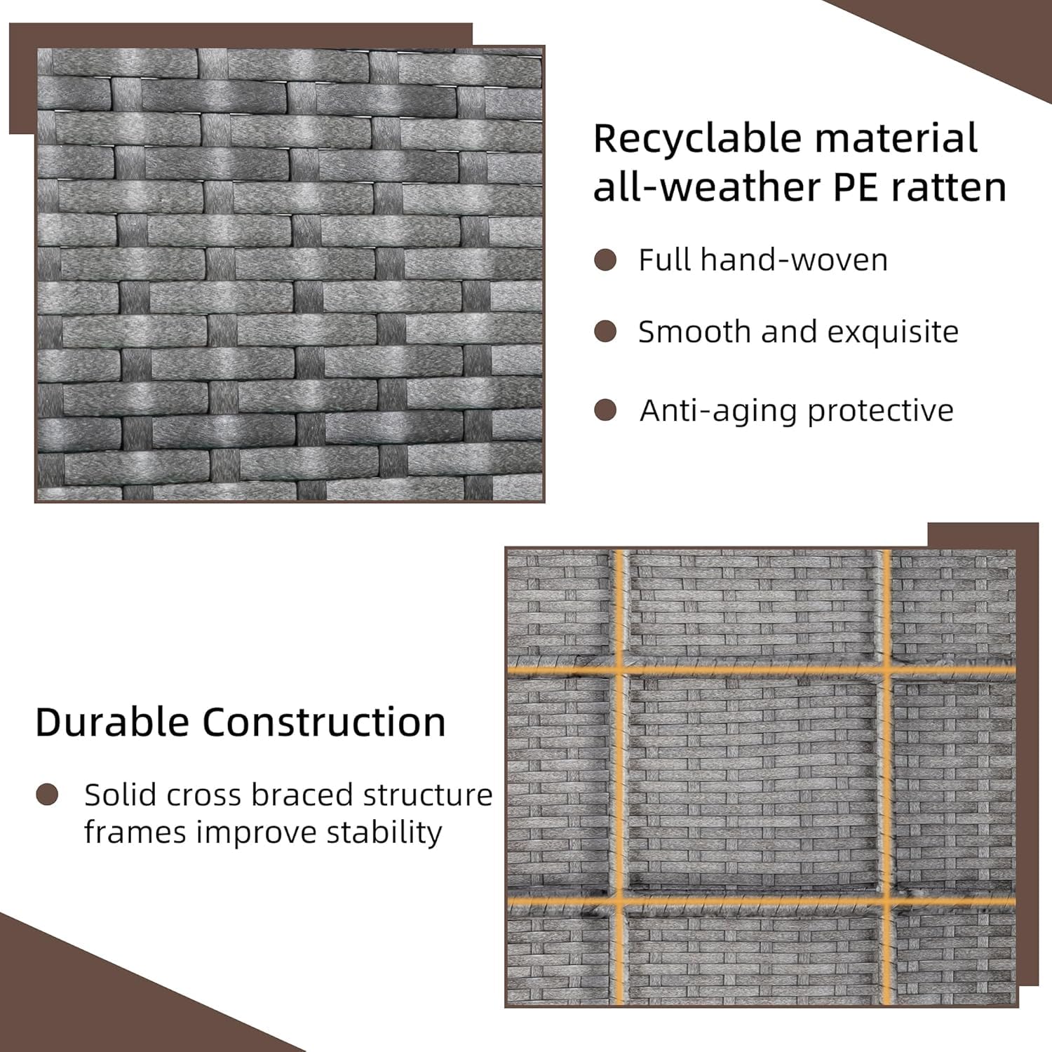 - 【PE Rattan & Solid Structure】Patio furniture made of high-quality and durable Steel Frame and hand-woven Rattan, Built to last, resistant to deformation, large load capacity. Hand-woven rattan provides both elegance and adaptability to all weather conditions.