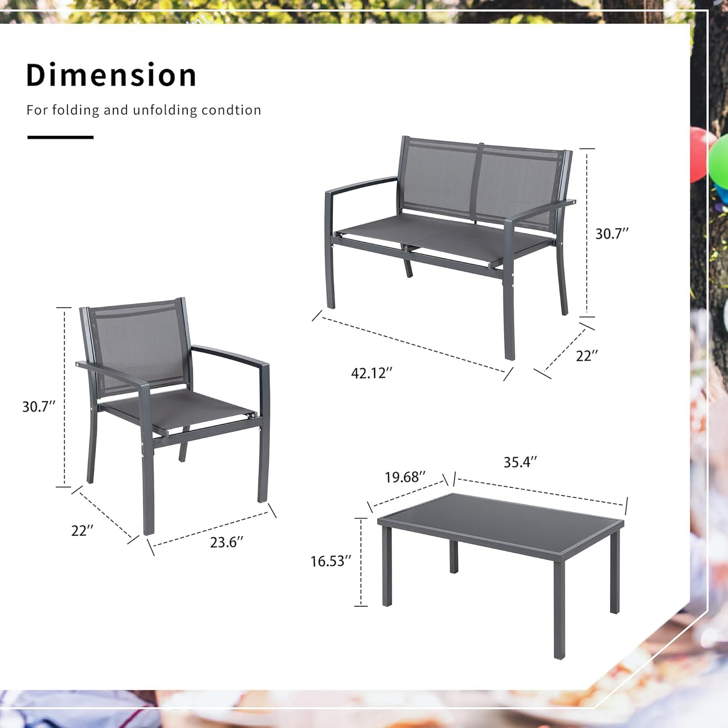 Shintenchi 4 Pieces Patio Furniture Set All Weather Textile Fabric Outdoor Conversation Set, with Glass Coffee Table, Loveseat, 2 Single Chairs for Home, Garden, Lawn, Porch(Gray)