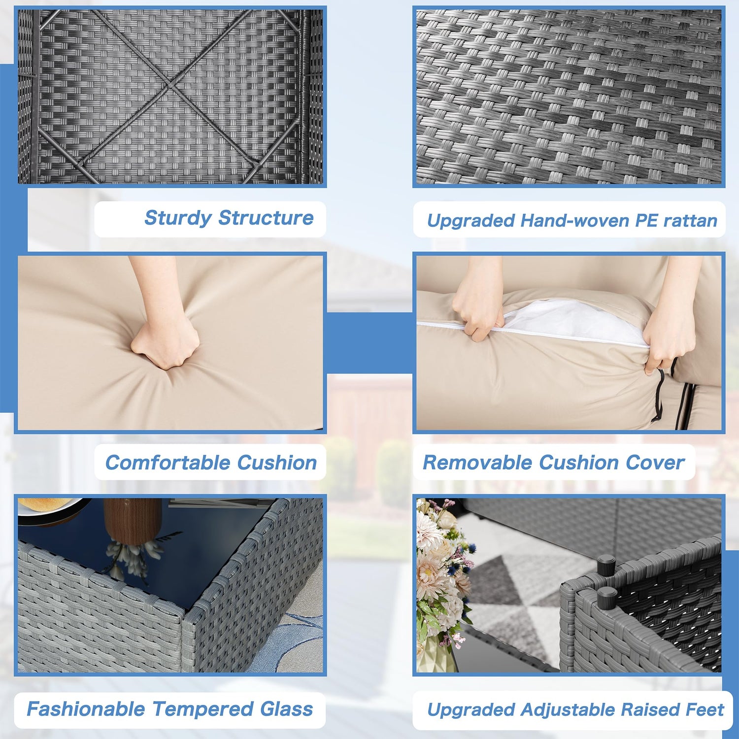 - Sturdy&Durable: Solid metal structure make it super safe to sit in the sofa set. Added bars for the frame enhance the sturdiness and allow the sofa to support heavy people about 400lbs. Adjustable feet make it steady on uneven surfaces. PE Wicker is strong enough to survive inclement weather and guarantee the set has a long service life.Note: cushions are not water-proof, When you don' t use it, advise you to take cushions inside or buy a cover for longer service time.