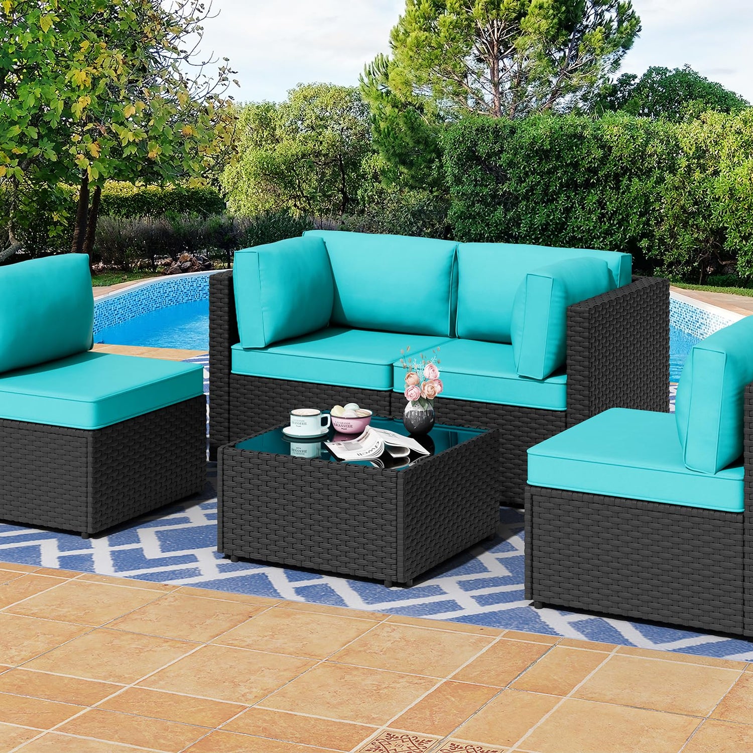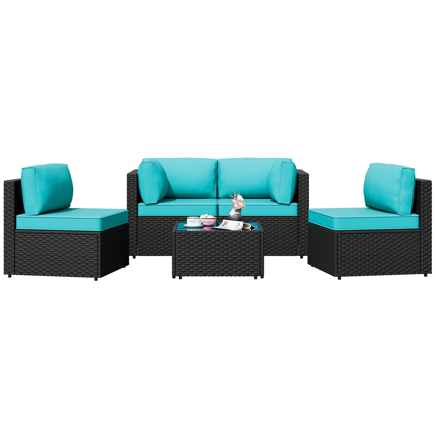 Shintenchi 5 Pieces Outdoor Patio Sectional Sofa Couch, Black PE Wicker Furniture Sets, Patio Conversation Sets with Washable Cushions Glass Coffee Table for Garden, Poolside, Backyard,Blue