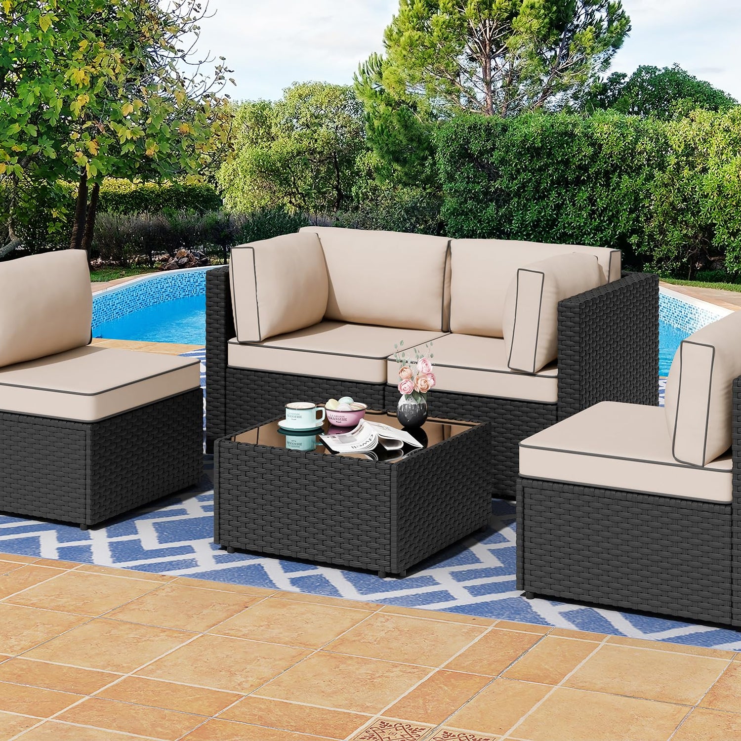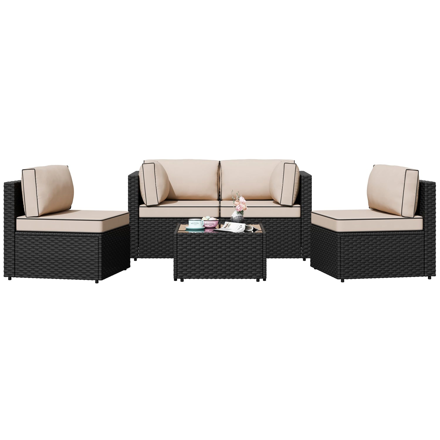 Shintenchi 5 Pieces Outdoor Patio Sectional Sofa Couch, Black PE Wicker Furniture Sets, Patio Conversation Sets with Washable Cushions Glass Coffee Table for Garden, Poolside, Backyard,(Khaki)