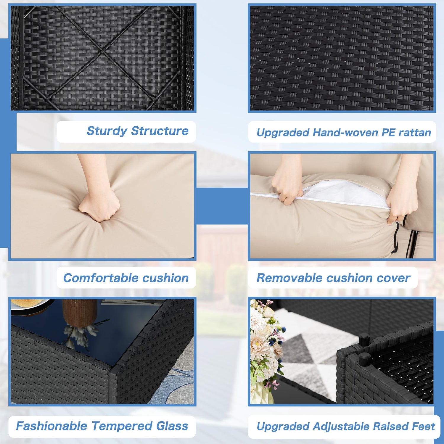 - Sturdy&Durable: Solid metal structure make it super safe to sit in the sofa set. Added bars for the frame enhance the sturdiness and allow the sofa to support heavy people about 300lbs. Adjustable feet make it steady on uneven surfaces. PE Wicker is strong enough to survive inclement weather and guarantee the set has a long service life.Note: cushions are not water-proof;(When you don' t use it, advise you to take cushions inside or buy a cover for longer service time)