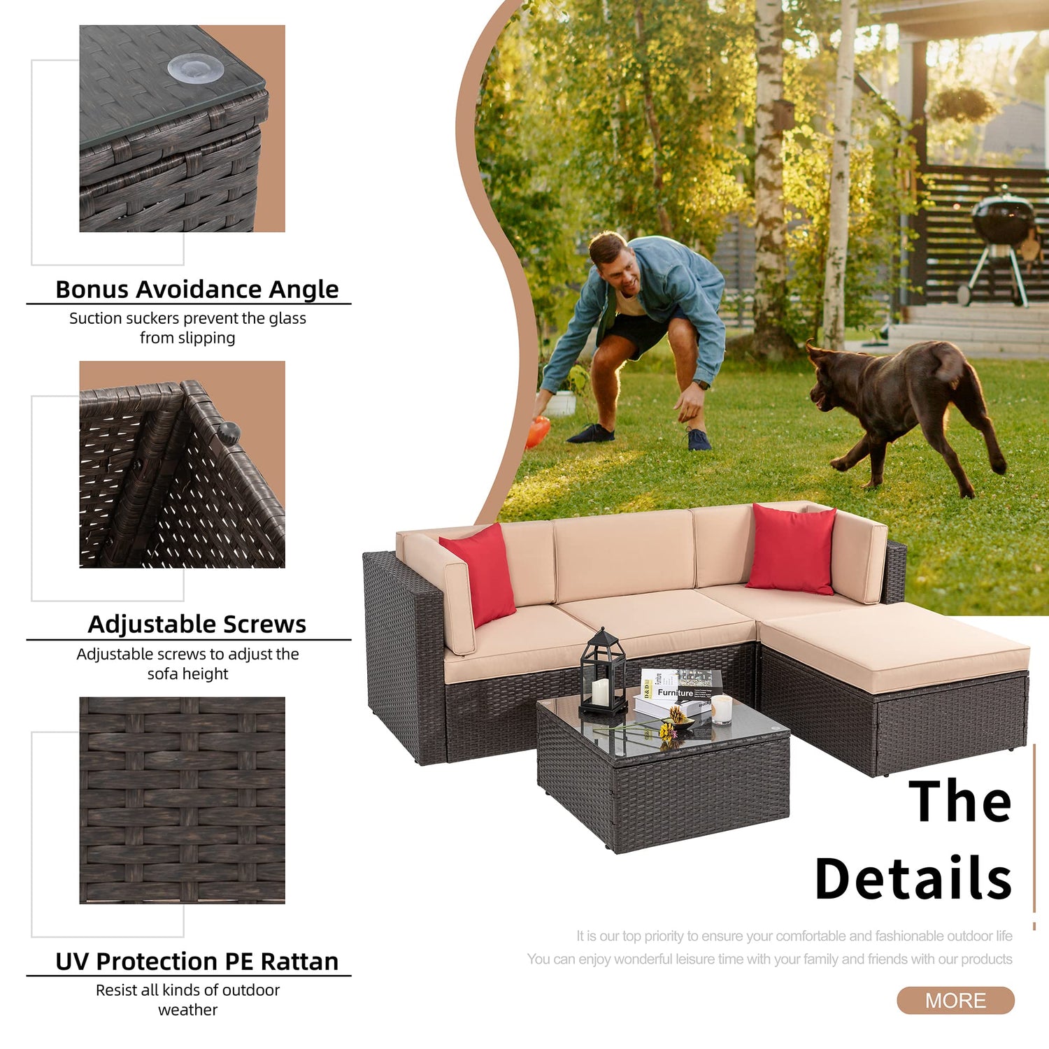 Shintenchi 5 Pieces Patio Furniture Sets Outdoor All-Weather Sectional Patio Sofa Set PE Rattan Manual Weaving Wicker Patio Conversation Set with Glass Table&Ottoman Cushion and Red Pillows