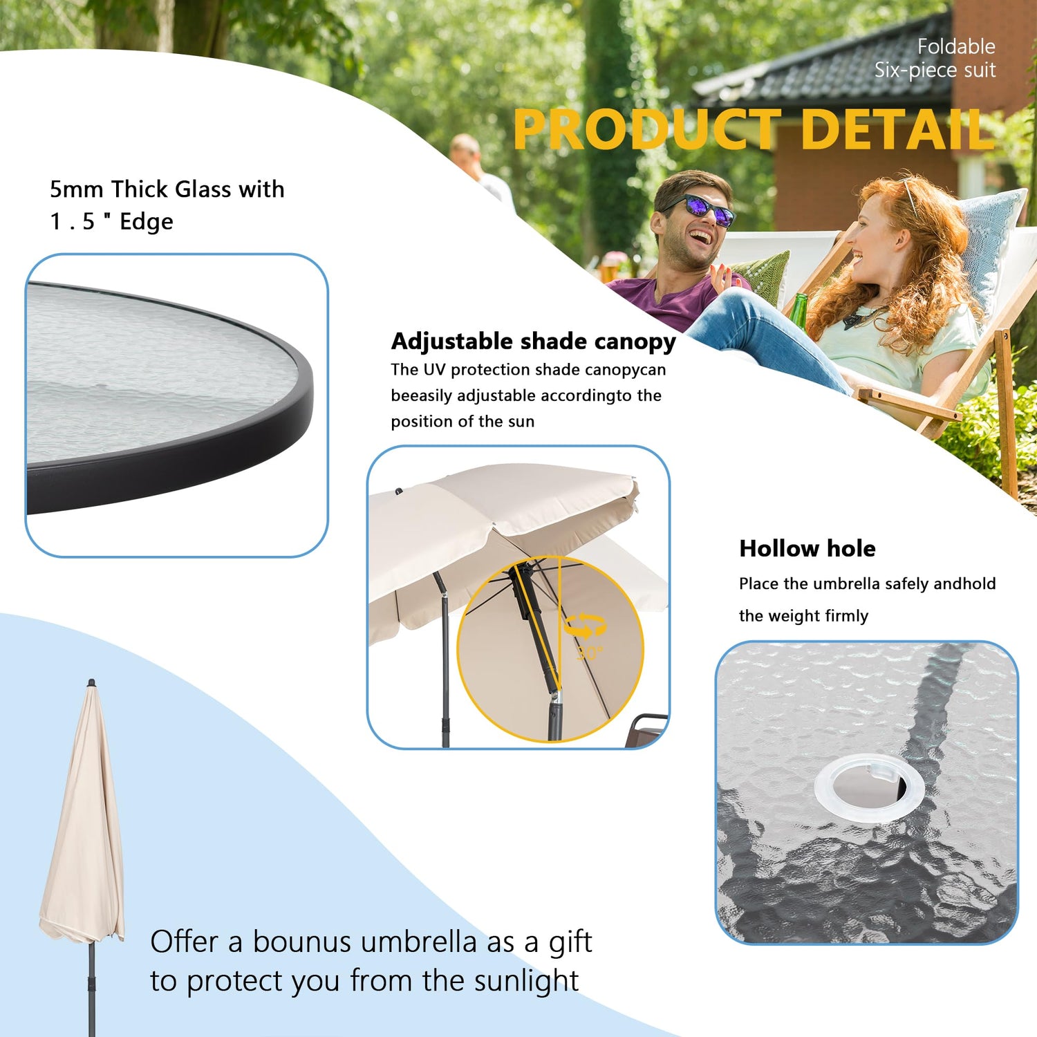 Details: 6 pieces patio garden set brings you the most comfortable and practical use experience.The ideal choice for outdoor recreation, such as garden, porch or backyard. Enjoy the beautiful weather with your family and friends, relaxing life on perfect outdoor chairs. Features: Tempered glass table top is safety and durability. The dining table with a pre-cut umbrella hole. The tilt angle of the umbrella can be adjusted. Folding chair is easy for your to storage and save space. Suitable size for small gatherings, on smaller decks and patios. Specifications: