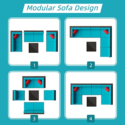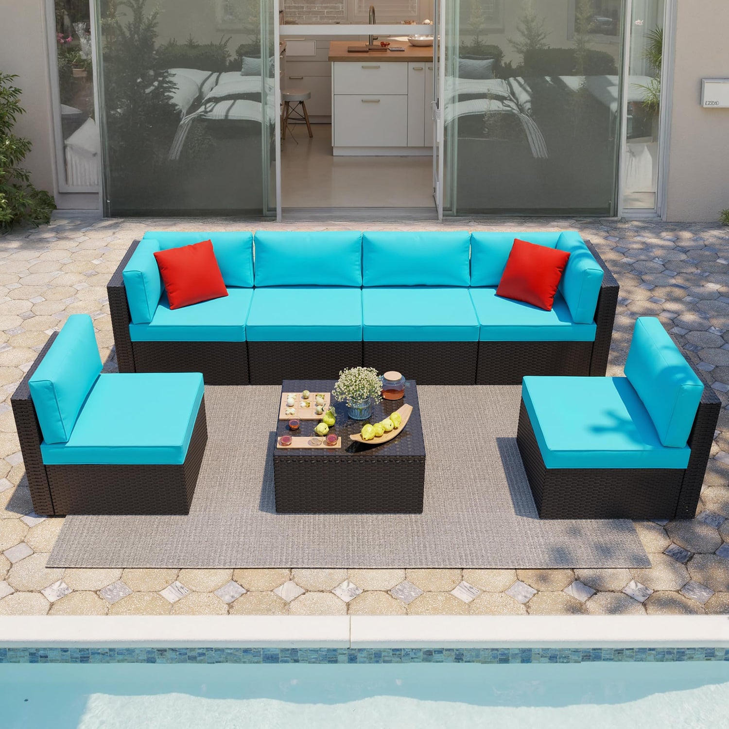Shintenchi 7 Pieces Patio Furniture Sets Outdoor All-Weather Sectional Patio Sofa Set PE Rattan Manual Weaving Wicker Patio Conversation Set with Glass Table&Ottoman Cushion and Red Pillows, Blue